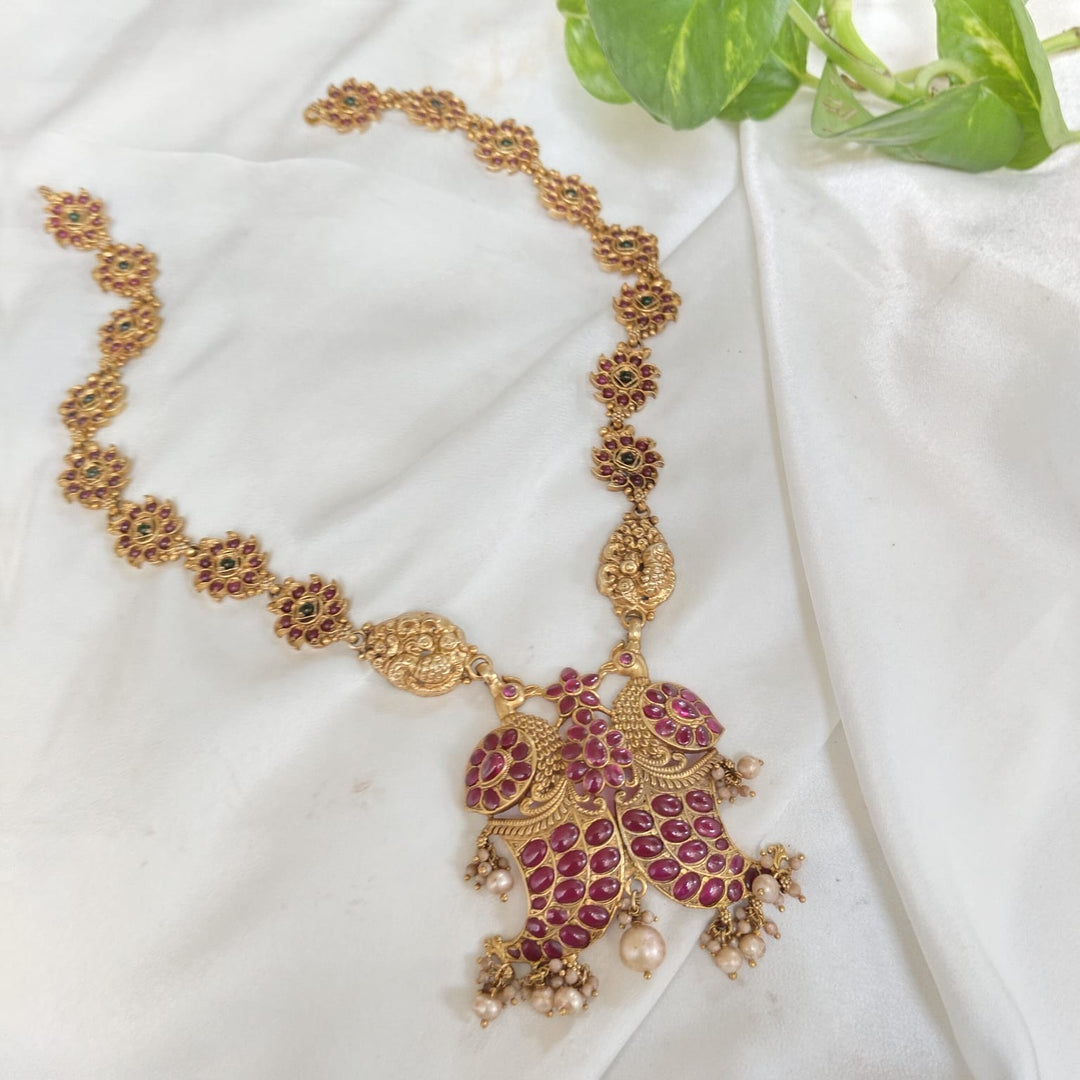 Crafted in pure silver, this necklace features vibrant red stones arranged in symmetrical patterns for a striking visual appeal.