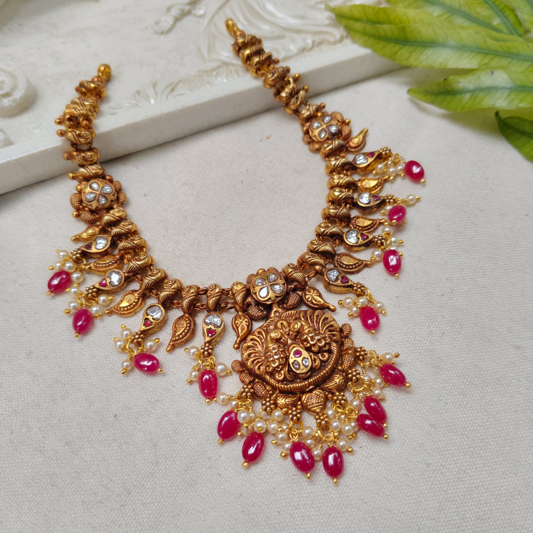 This silver necklace showcases a beautifully carved Lakshmi motif surrounded by intricate temple-style craftsmanship. Adorned with vibrant semi-precious stones and shimmering white accents, it radiates traditional elegance. Finished with delicate pearl clusters and bead drops, it is perfect for festive and bridal occasions.