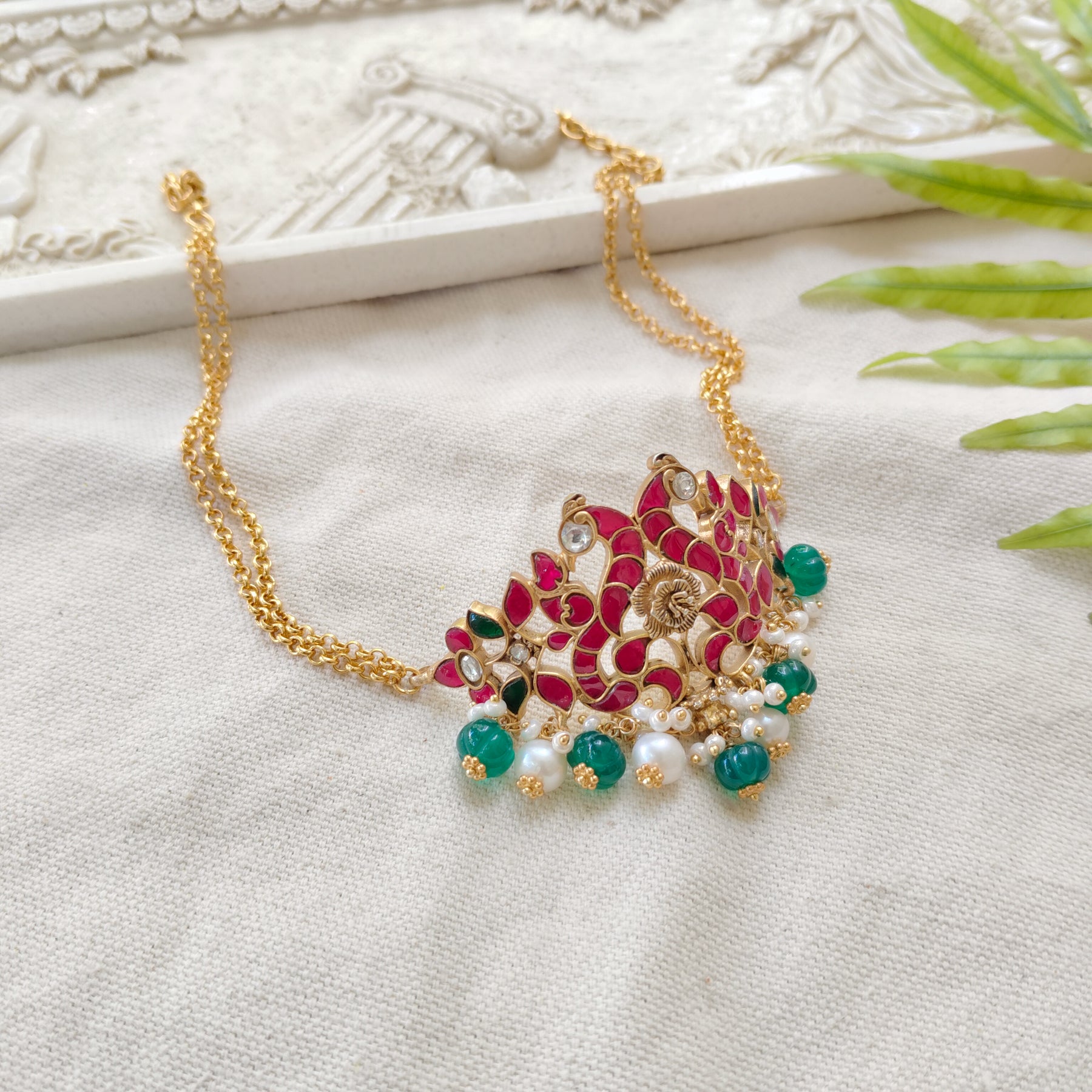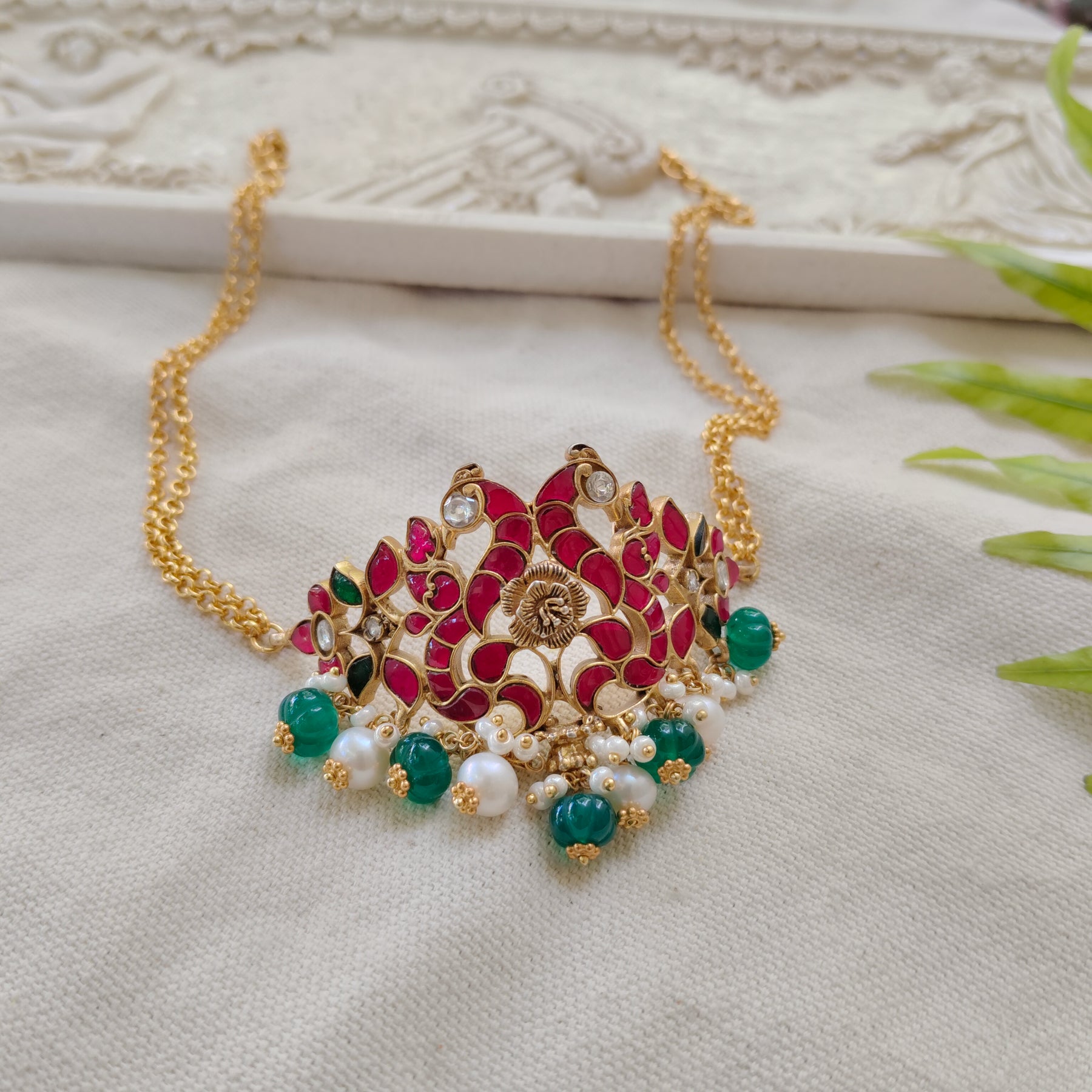 This exquisite silver necklace showcases a vibrant floral motif adorned with stons emerald-green, and pearl detailing. The intricate craftsmanship highlights traditional elegance with a modern touch. Perfect for festive and bridal occasions, it adds a radiant and graceful charm to any look.