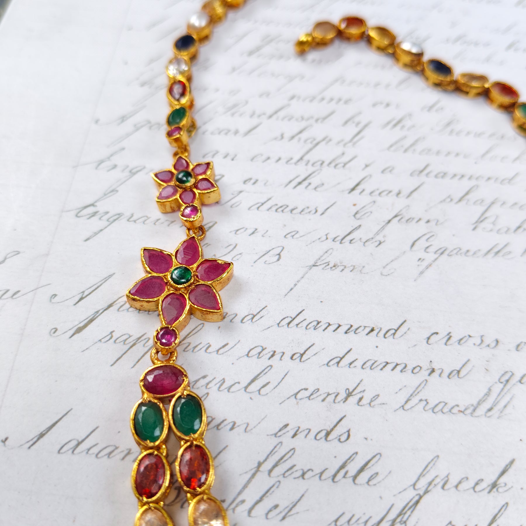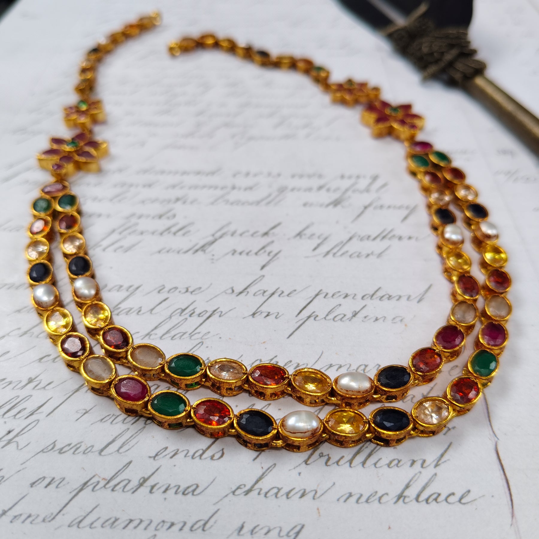 Crafted in silver and embellished with a trio of vibrant gem-studded layers, this necklace exudes festive grandeur. The colorful stones, set in a traditional design, reflect a perfect harmony of heritage and elegance. Ideal for weddings and celebrations, it brings timeless charm to every look.