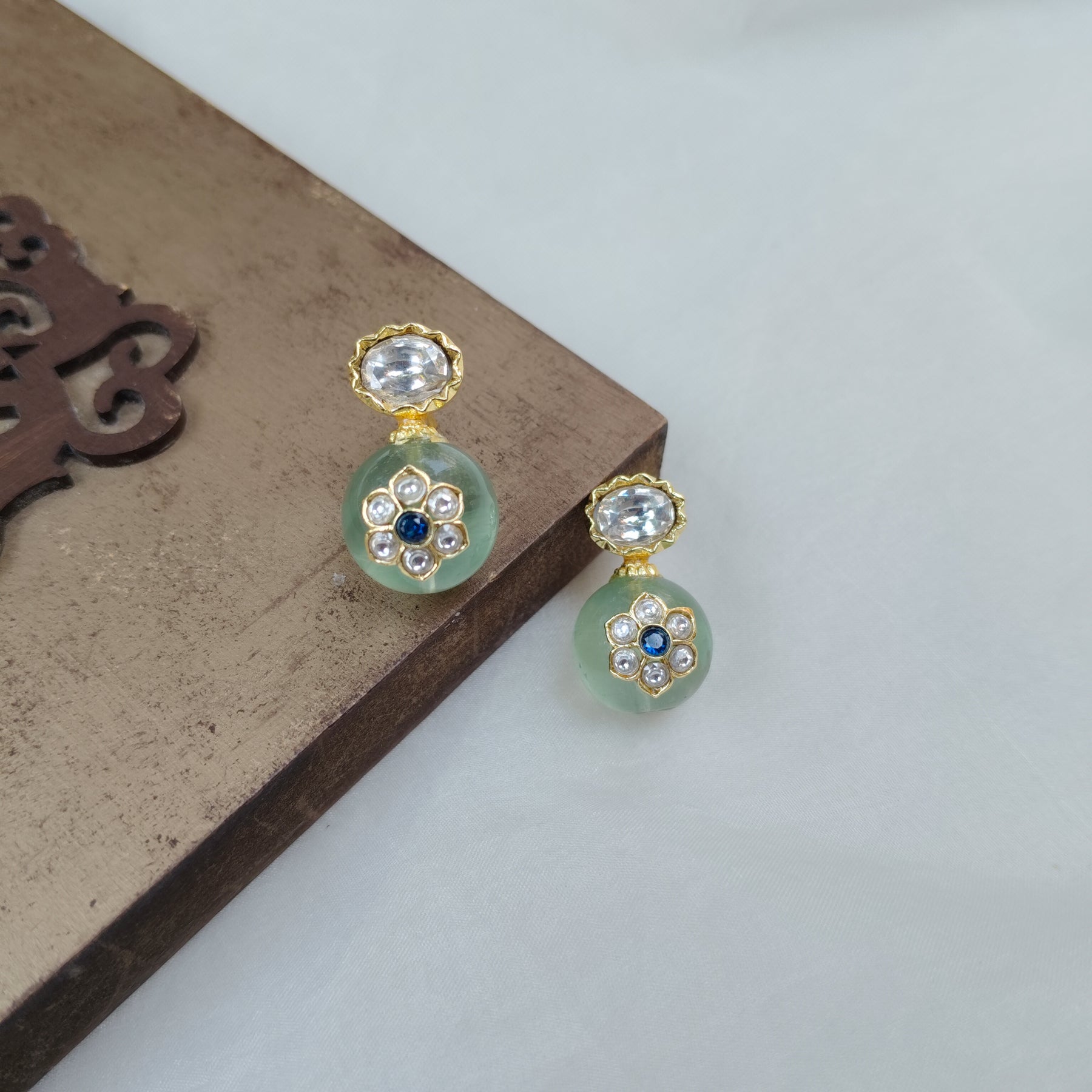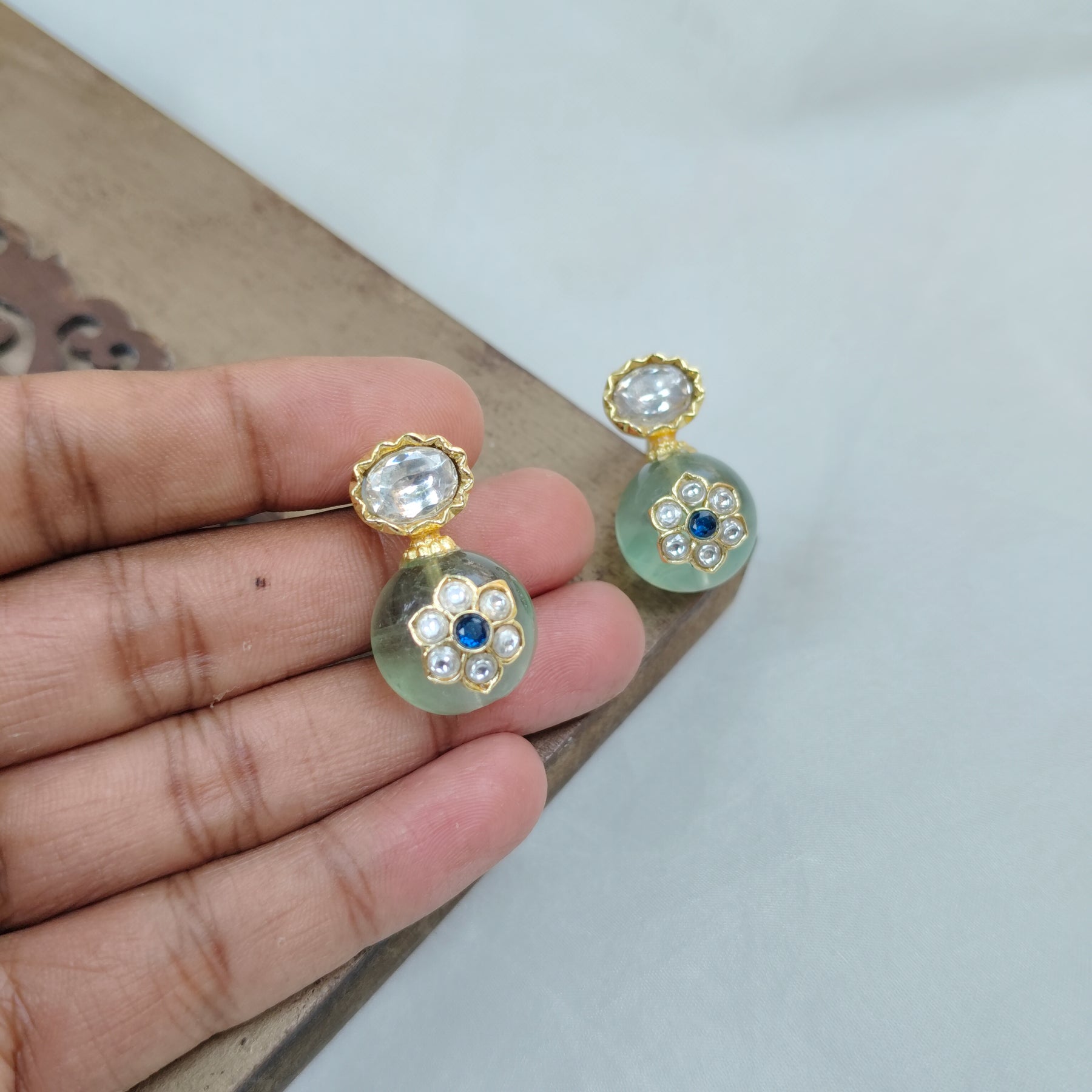 These elegant brass earrings feature a shimmering oval-cut mirror stone set in a delicate gold frame. The soft green drop is adorned with a floral arrangement of sparkling white and deep blue stones, adding a touch of grace and sophistication. Perfect for elevating any outfit with a hint of nature-inspired charm.