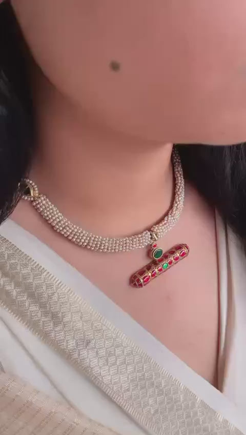 This handcrafted silver necklace features a woven white pearl band paired with a vibrant tube-shaped pendant adorned with semi-precious stones.