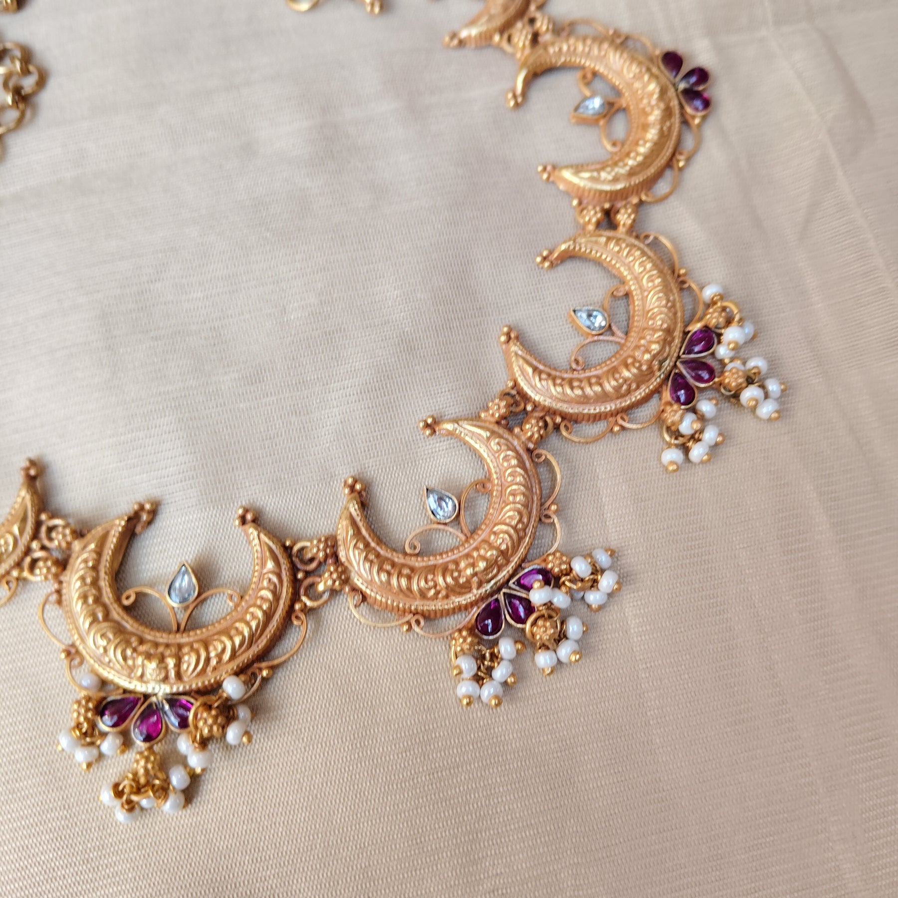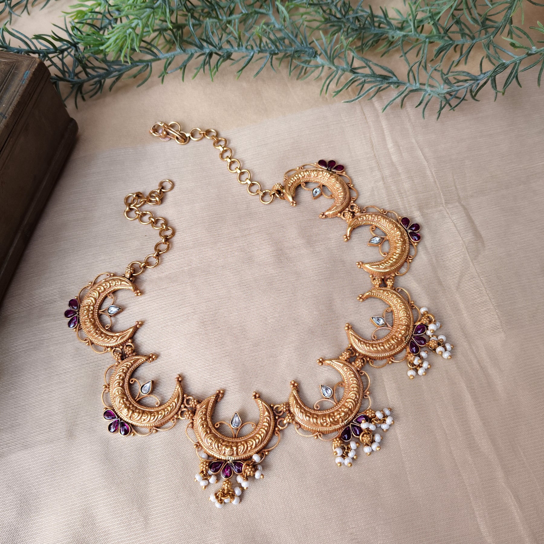 A stunning 92.5 silver temple-style choker featuring intricately carved crescent moon motifs with antique gold finish.