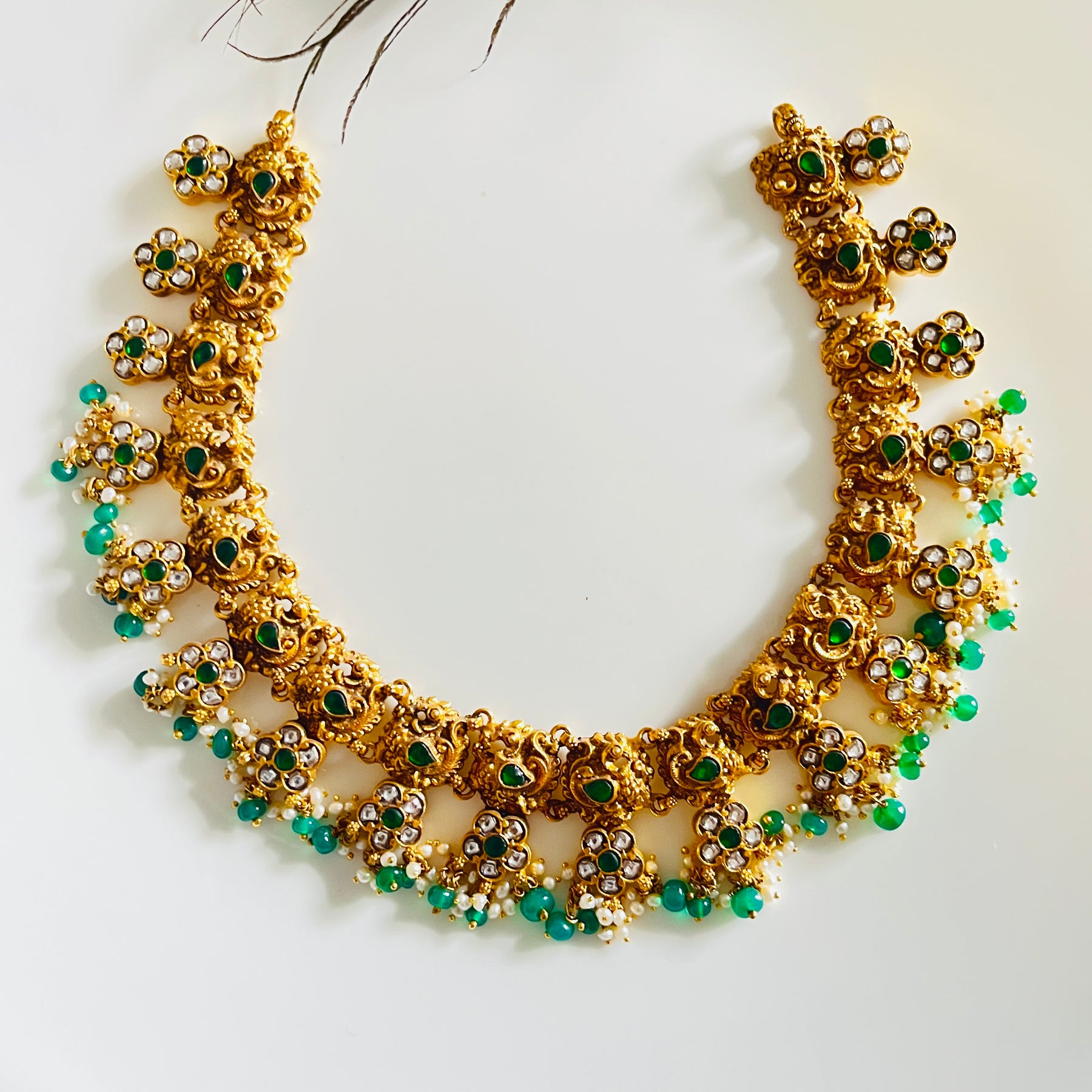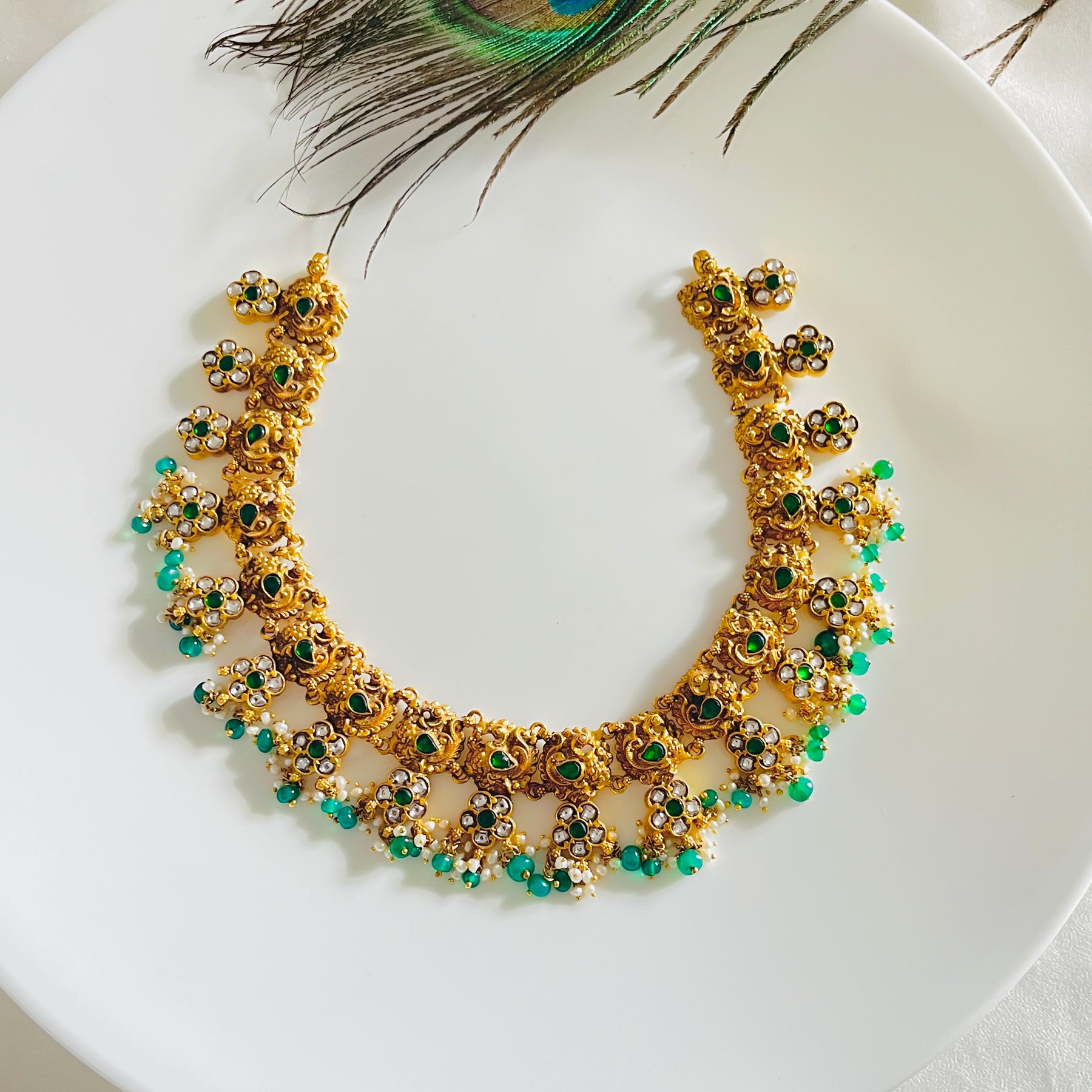 Delicate floral clusters and dangling emerald beads create a garden of timeless elegance around the neck.