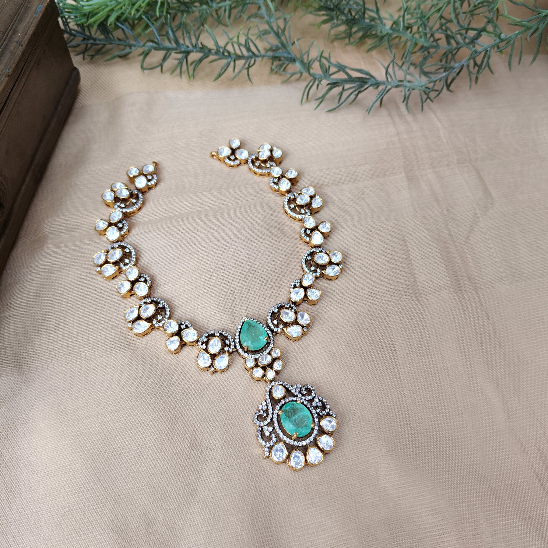 92.5 silver Victorian-inspired choker adorned with sparkling and a vivid emerald-green semi-precious center stone.