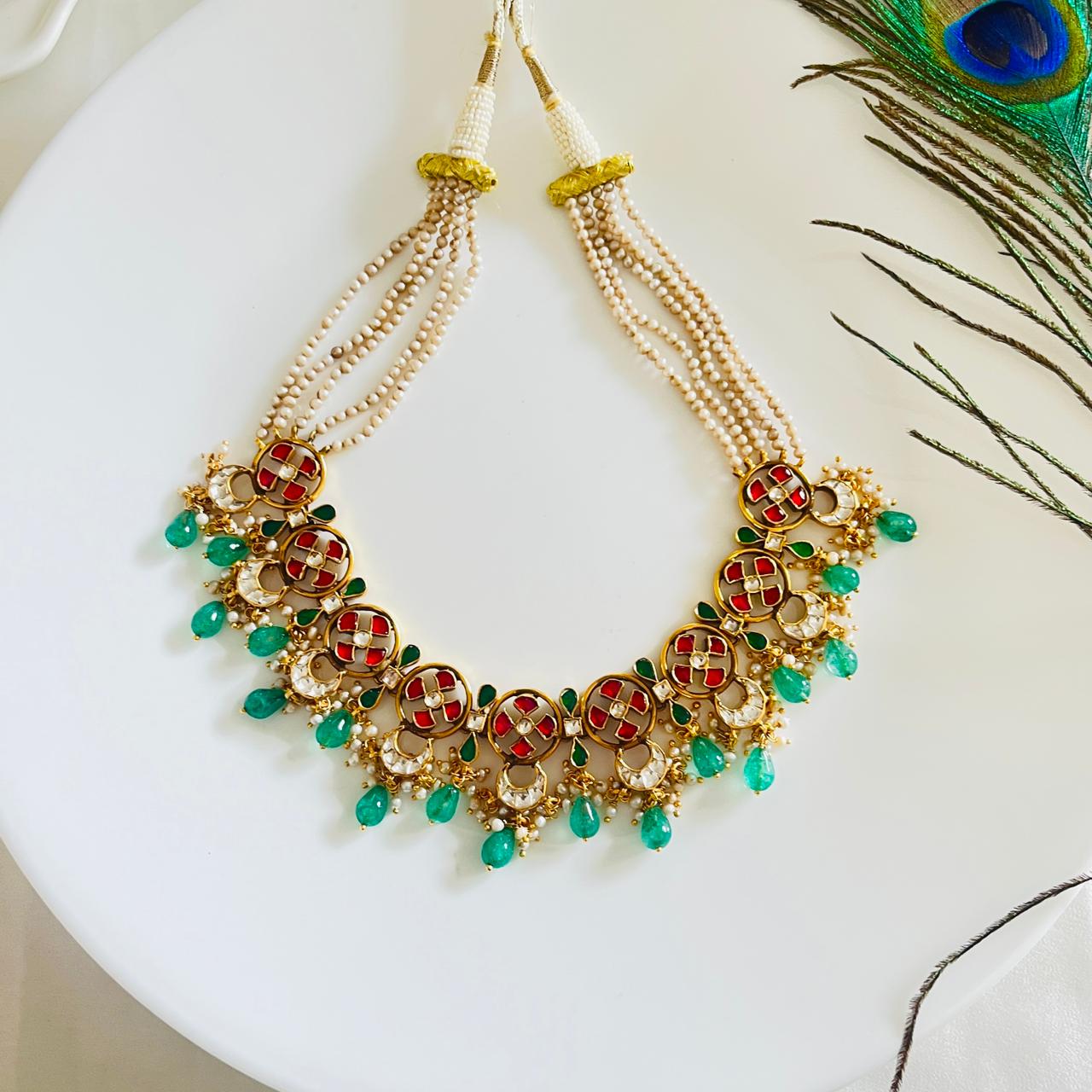 This elegant silver necklace features intricate lattice-style motifs highlighted with rich semiprecious stones in red and green. The layered pearl strands add a touch of grace and traditional charm. The emerald drops bring refreshing vibrance, making it perfect for festive and ethnic wear.