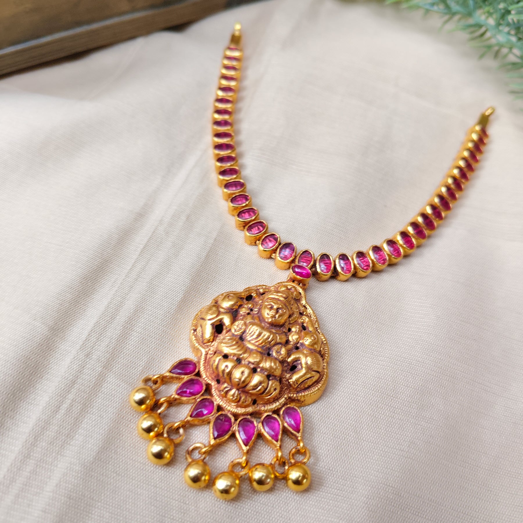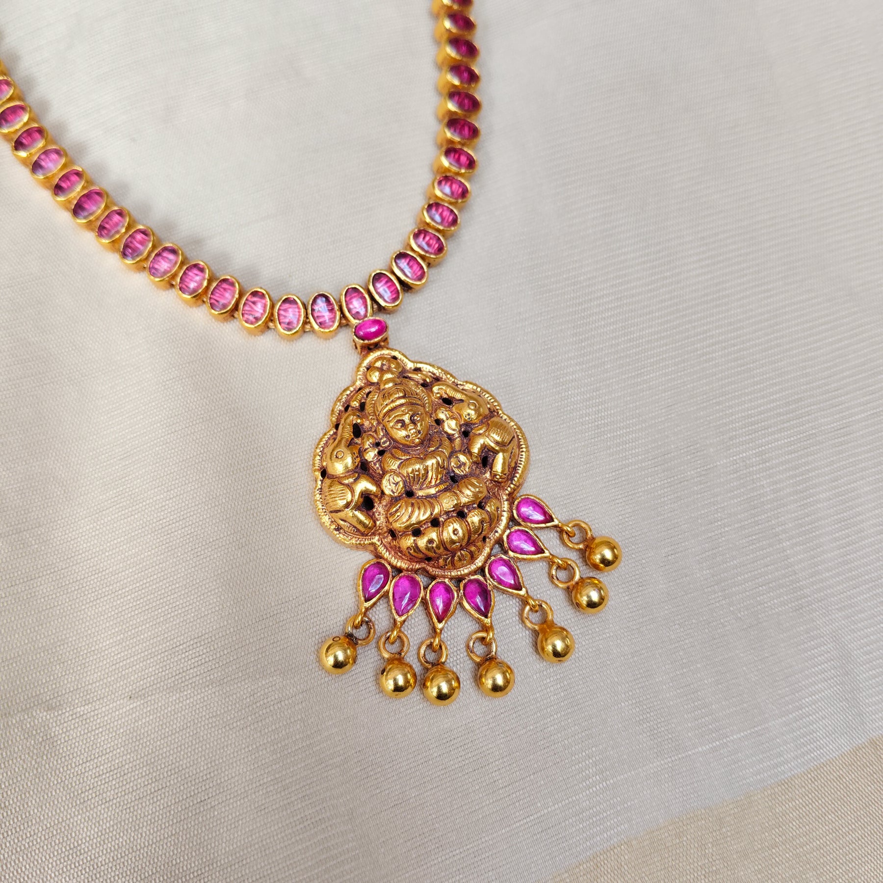This elegant silver necklace features semi-precious stones arranged in a classic single-line design. The beautifully crafted Lakshmi pendant adds a divine and traditional charm. Perfect for festive occasions, it blends heritage artistry with a graceful modern touch.