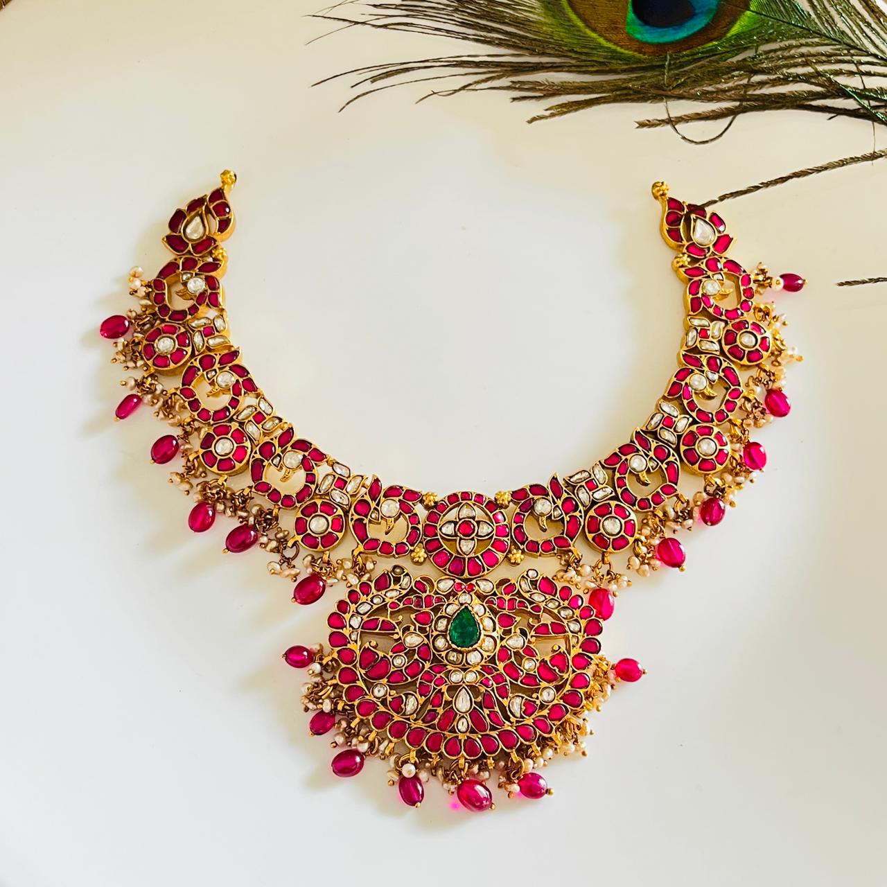 Intricate floral and paisley motifs cascade elegantly, crowned with a striking emerald centerpiece.