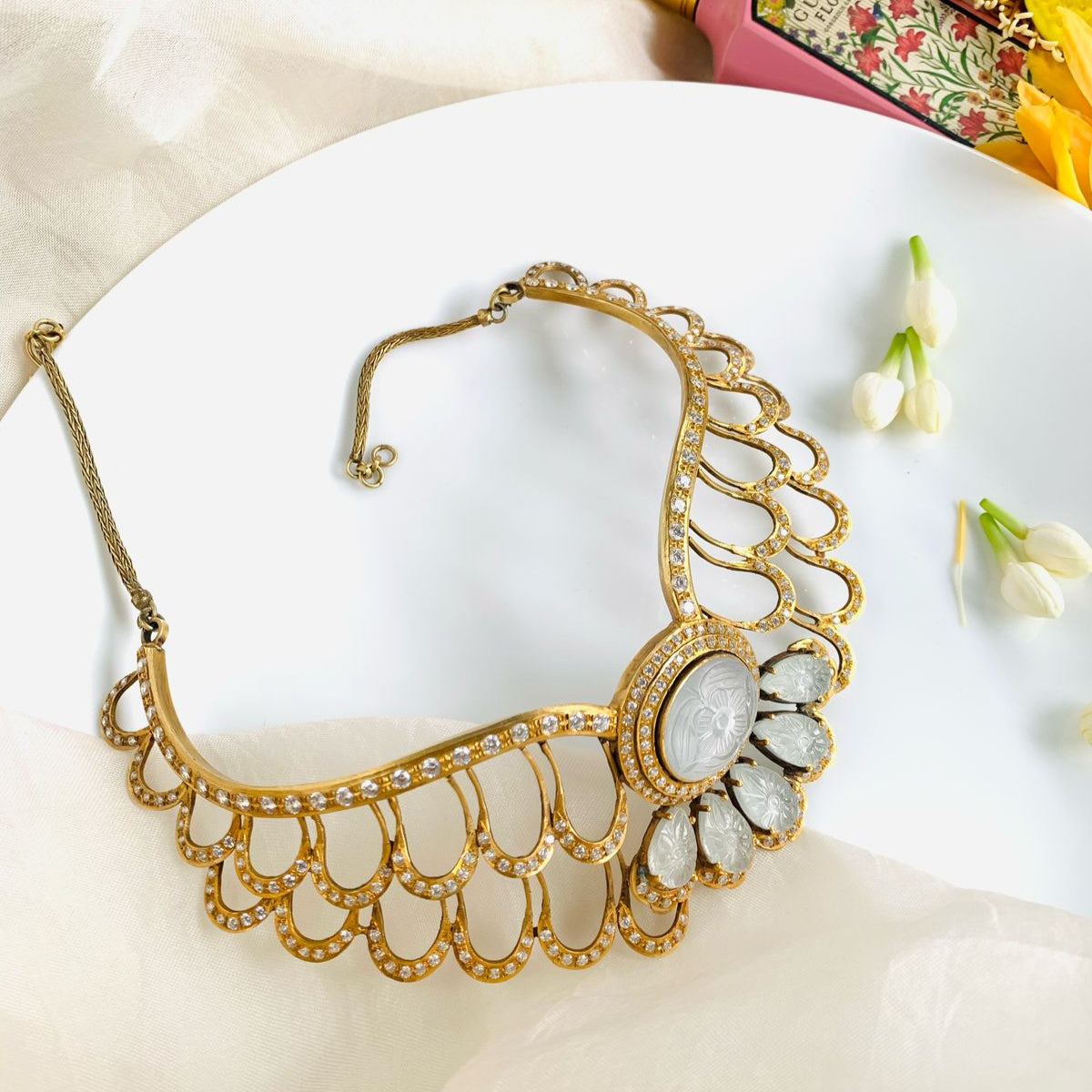 This silver-based necklace with a golden finish exudes delicate charm through its layered loop design and sparkling stonework. The carved central medallion with floral detailing adds a touch of artistic elegance. Ideal for weddings and grand occasions, it blends tradition with modern flair.