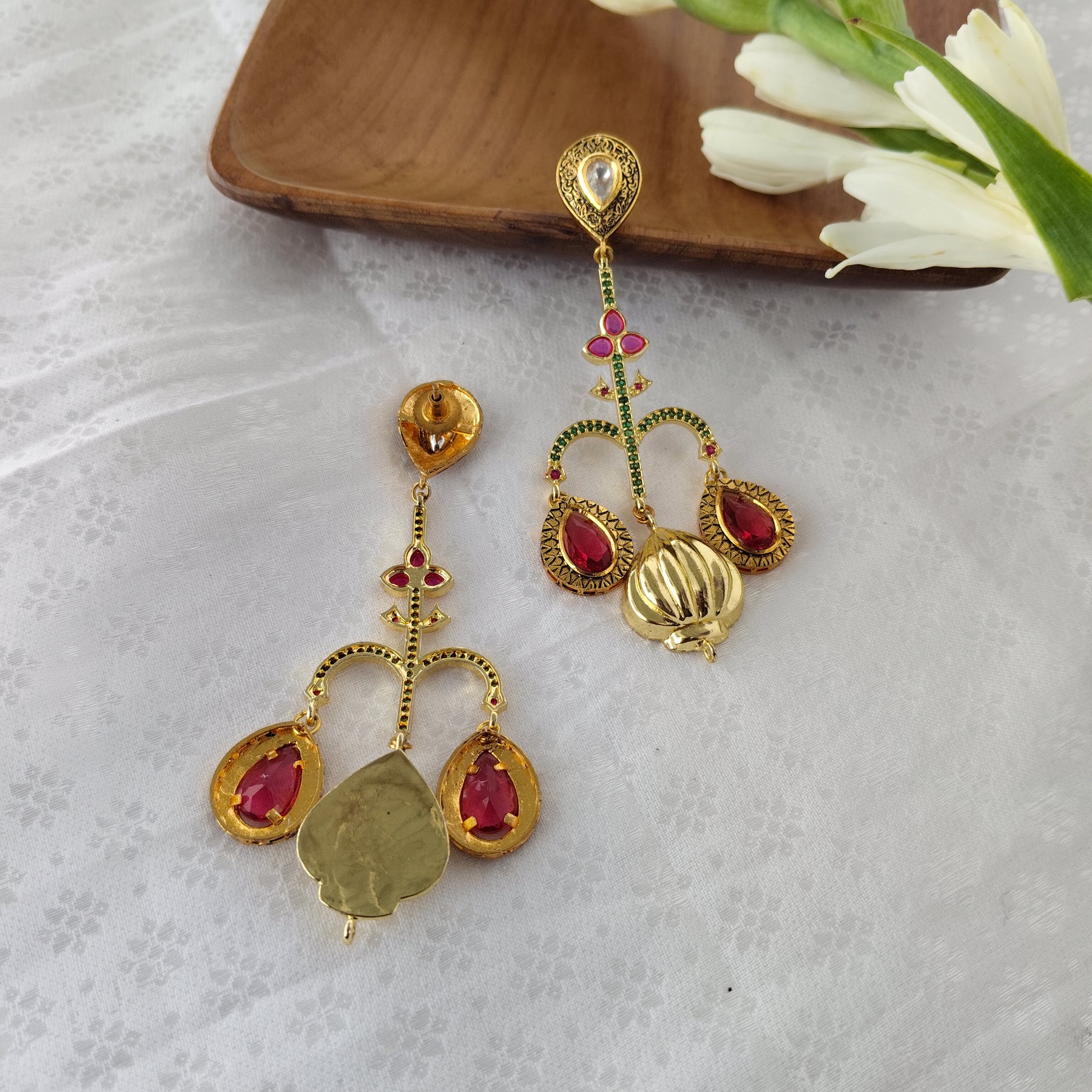 These stunning earrings are a masterpiece of intricate craftsmanship. The cascading design, adorned with rich crimson stones and delicate green accents, evokes the grandeur of bygone eras. The brass material adds a touch of warmth and authenticity, making these earrings a timeless piece of jewelry. Perfect for adding a touch of royal elegance to any outfit.