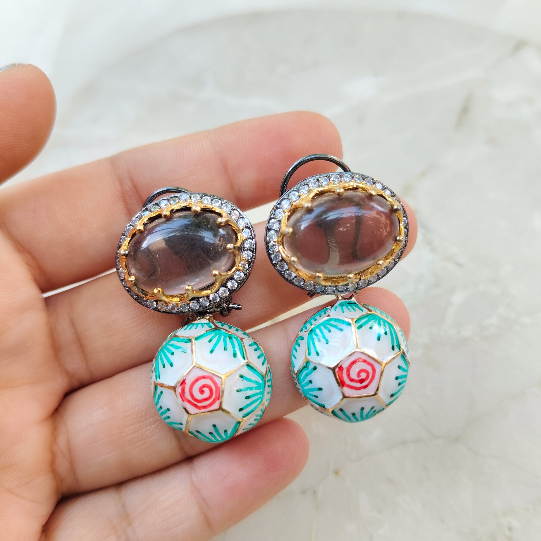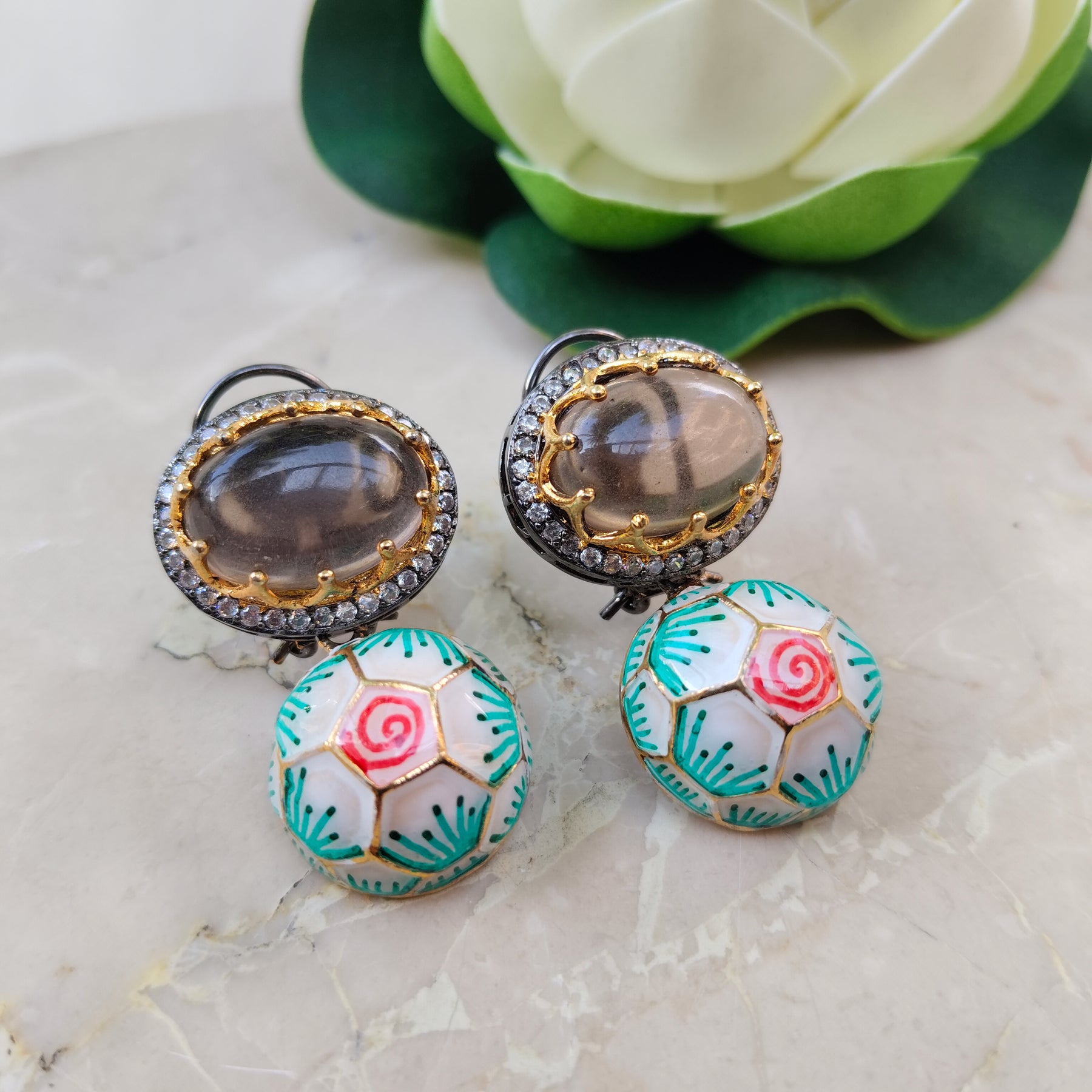 These enchanting earrings combine the allure of the sea with the elegance of floral motifs. The top portion features a smoky quartz stone with a delicate anchor design, while the bottom dangles a vibrant turquoise and white enamel flower.