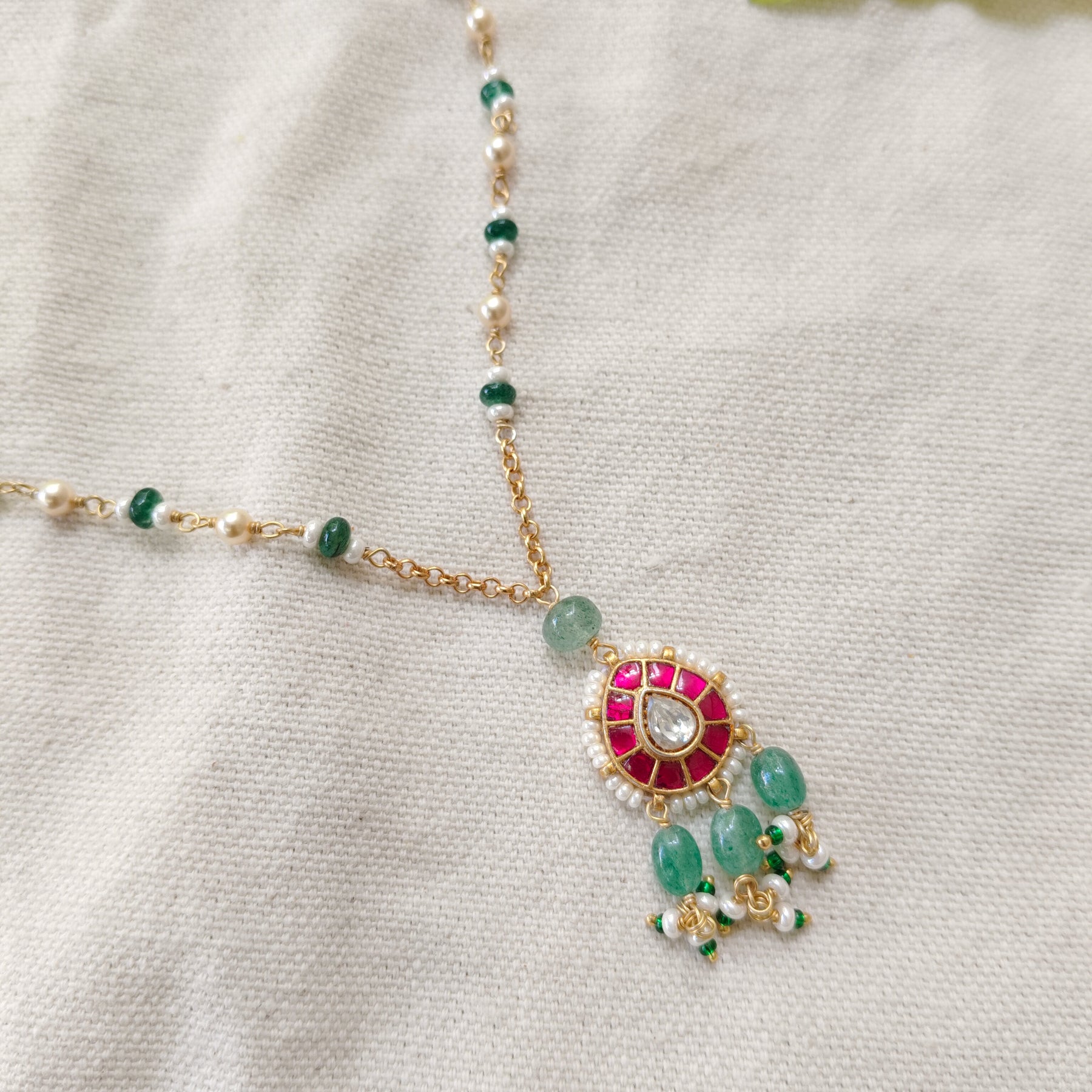 This delicate silver necklace features a charming pendant adorned with stons , emerald, and pearl accents. The elegant chain design with alternating green and white beads adds a subtle traditional flair. Perfect for everyday elegance or festive occasions, it beautifully complements ethnic and modern outfits alike.