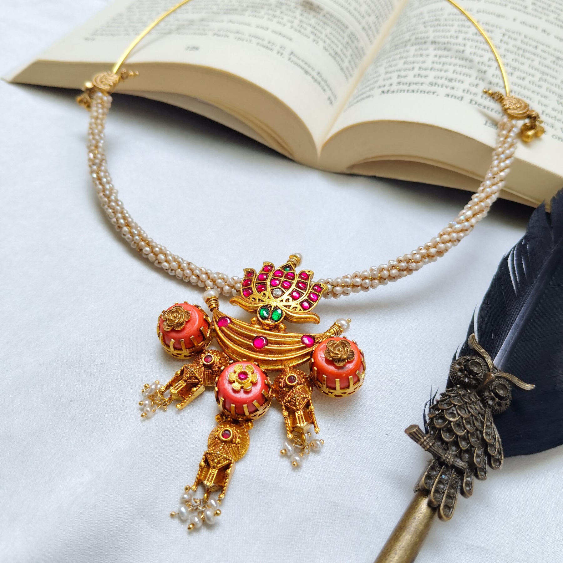 The ornate central pendant showcases vibrant semi-precious coral beads and  stones, accented with emerald green and intricate antique gold motifs.