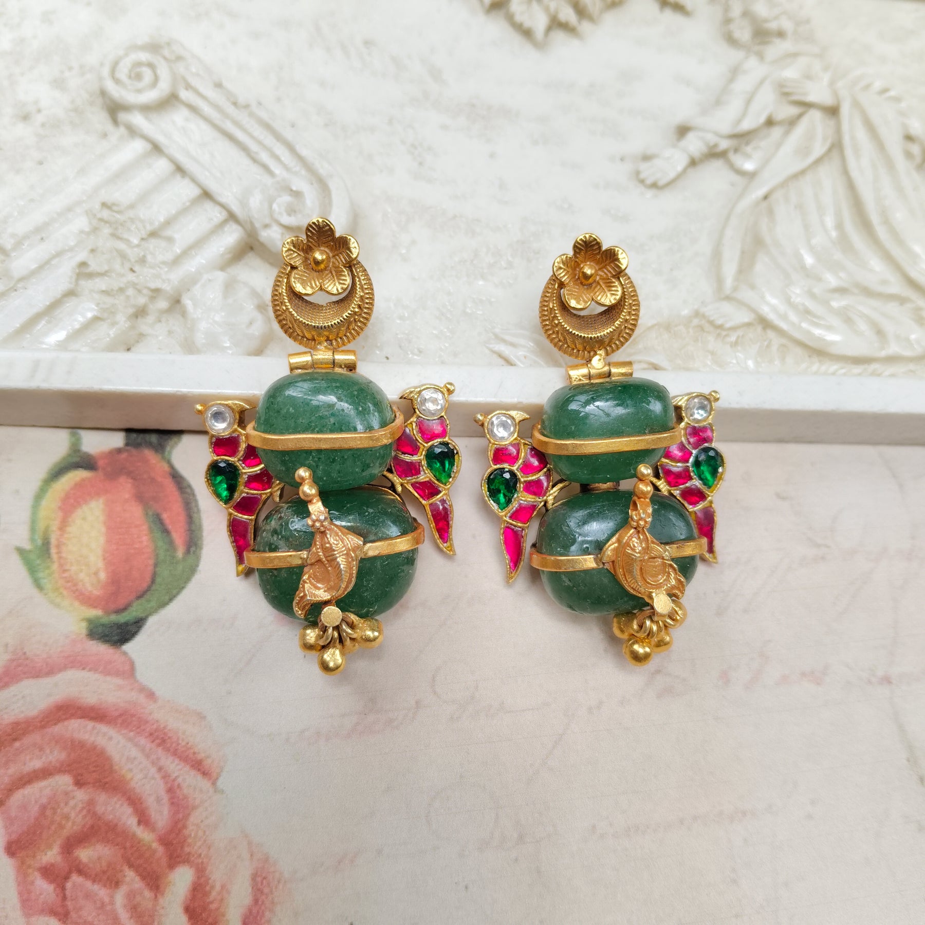 Crafted in silver with a rich gold finish, these earrings feature striking green stones framed by vibrant pink and green enamel leaves.