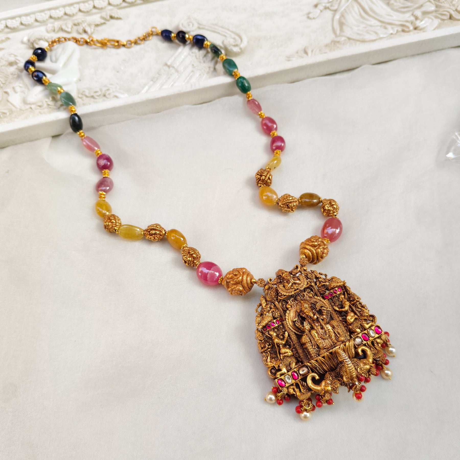 Adorned with semi-precious stones, soft pearl accents, and traditional bead detailing, it reflects timeless craftsmanship.