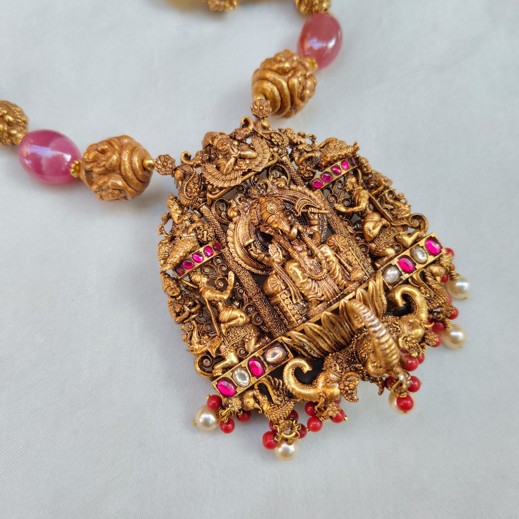 This exquisite temple necklace is crafted in silver with a rich antique gold finish, showcasing an intricately detailed Lord motif.