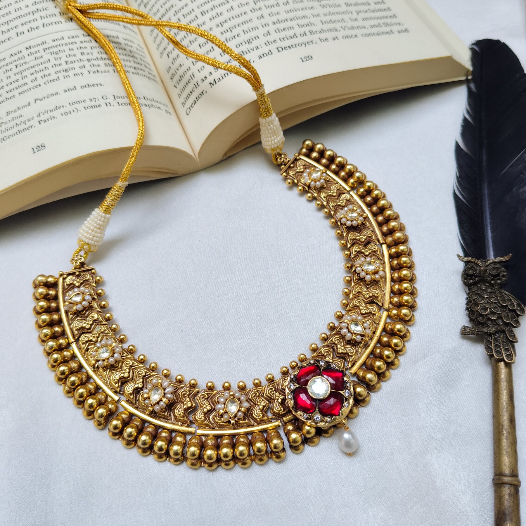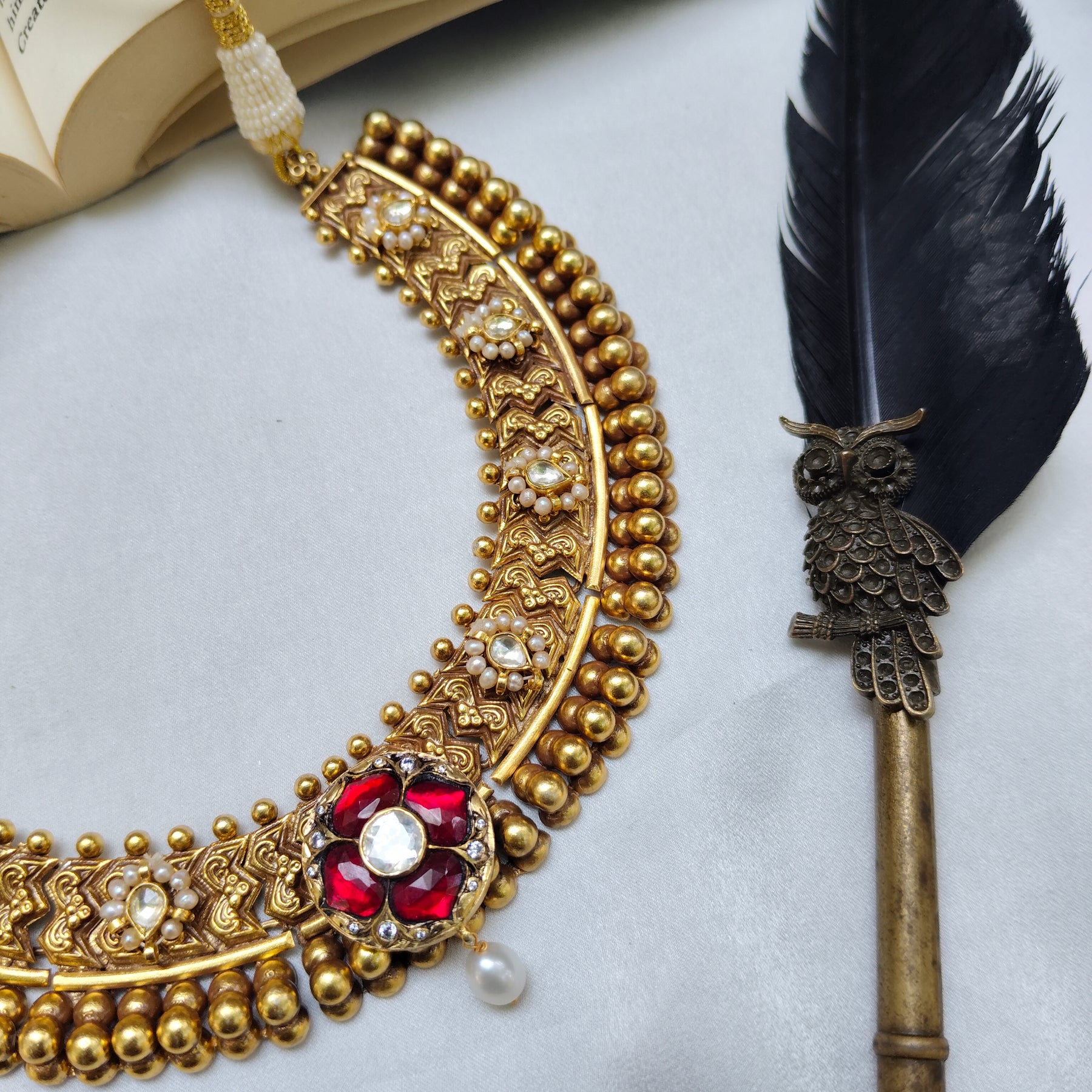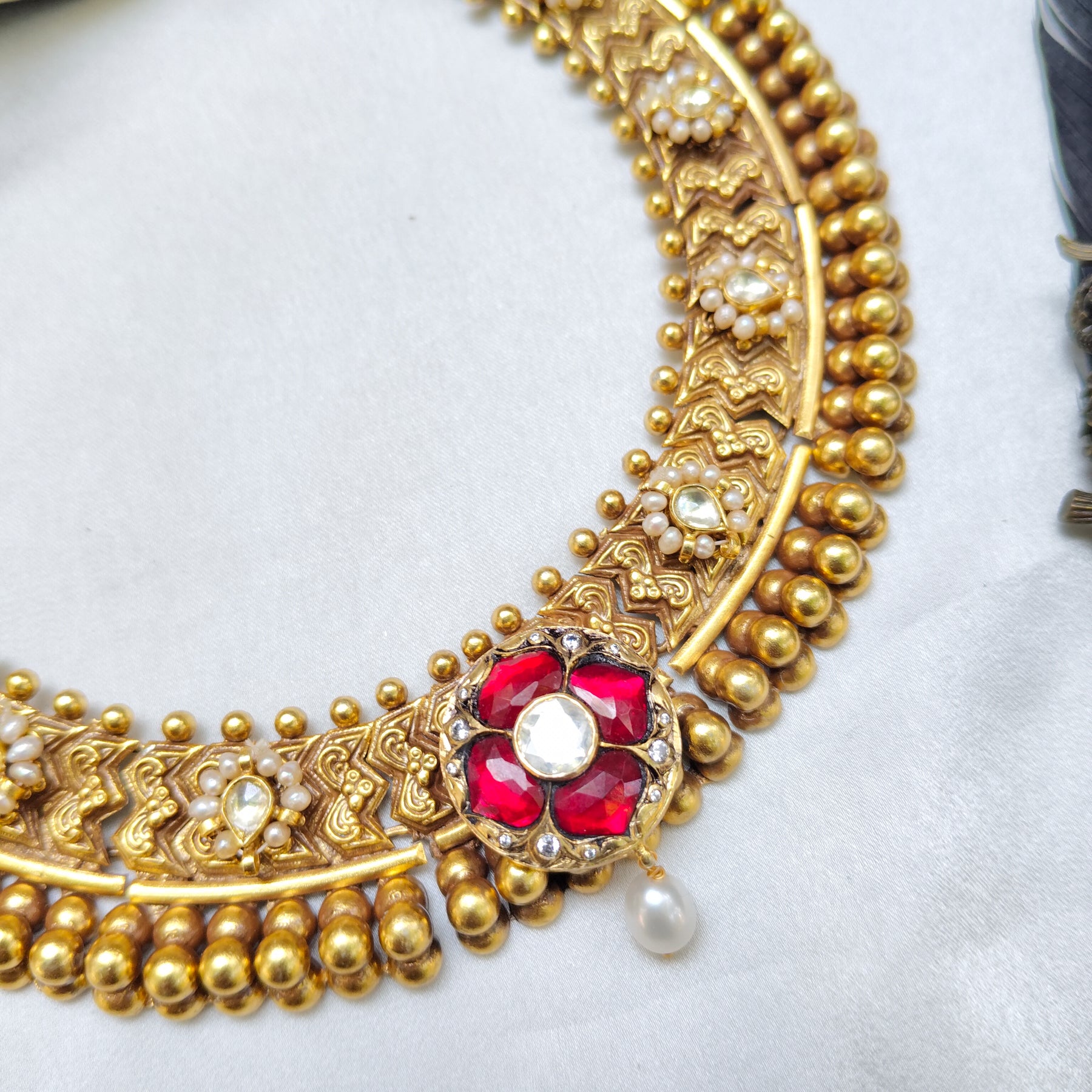 The central floral motif shines with vibrant stones, uncut polki , and a graceful dangling pearl drop.