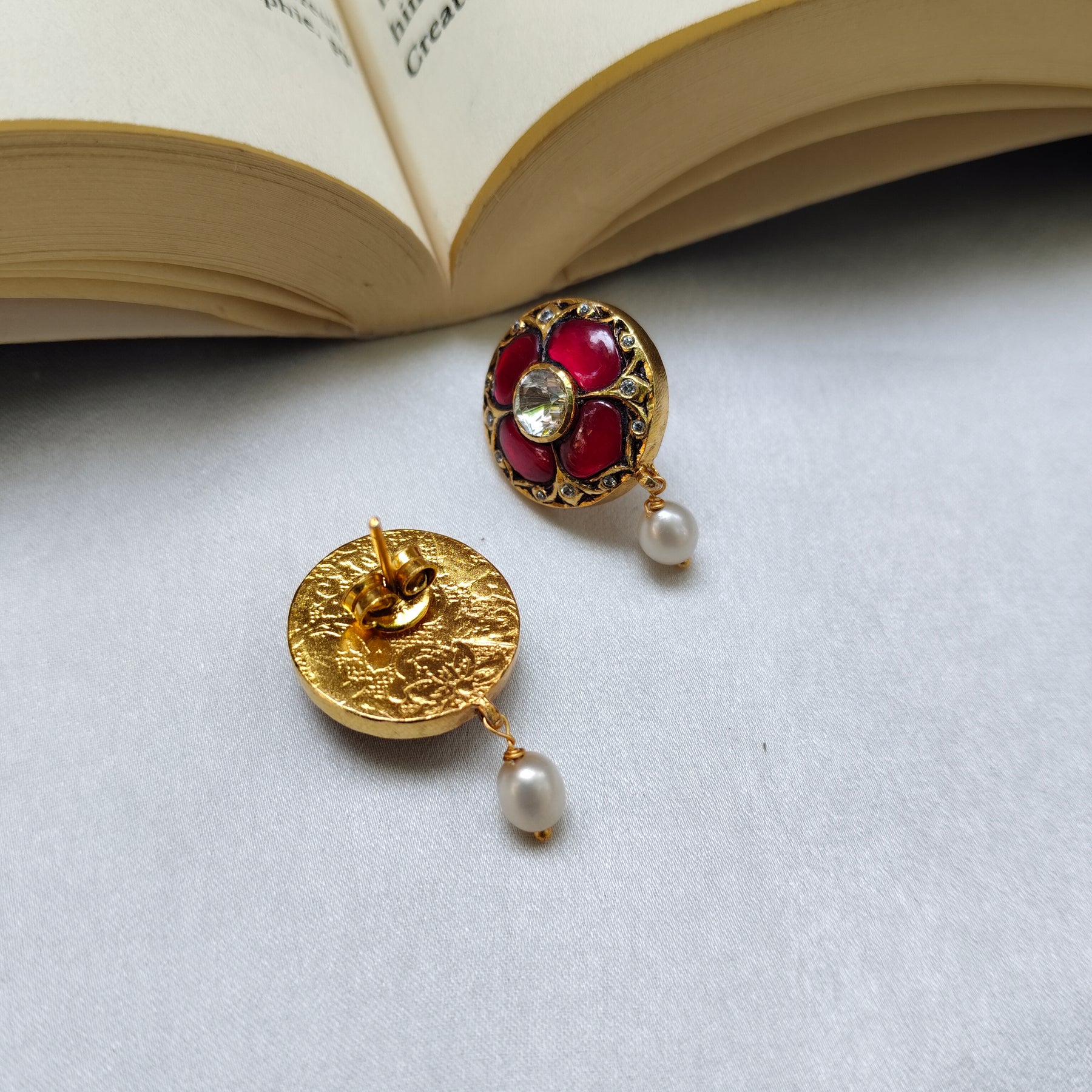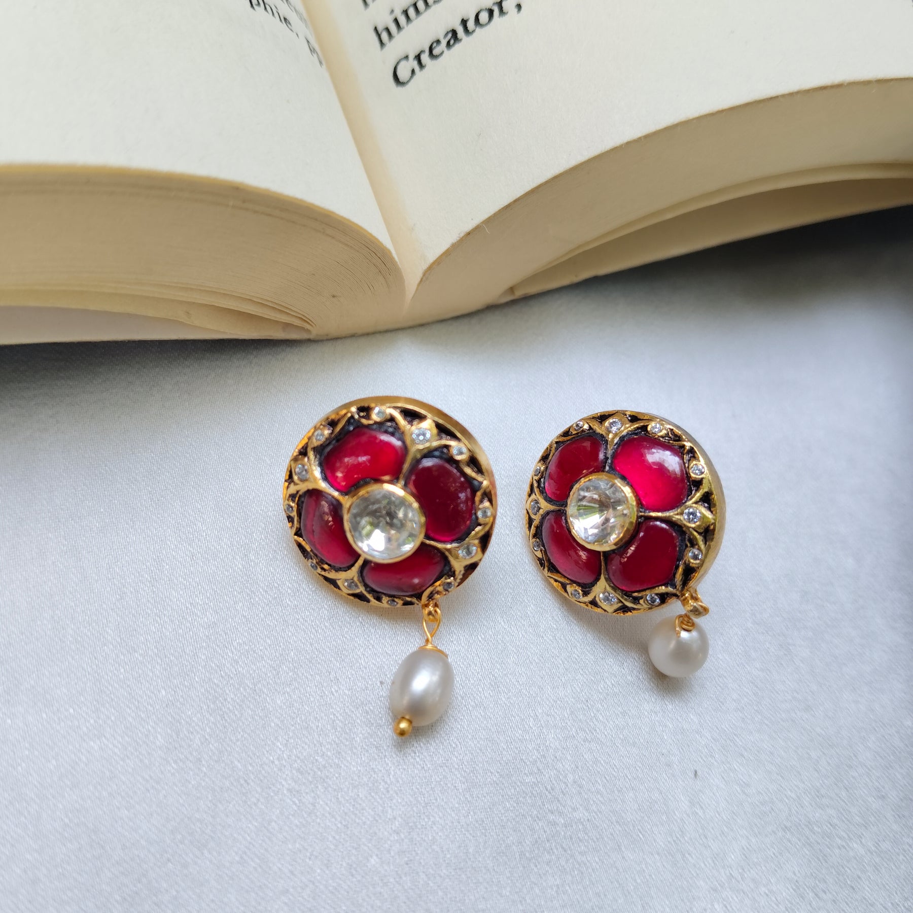 Delicate gold plating and subtle enamel work add antique temple jewelry charm, finished with a graceful pearl drop for gentle movement.