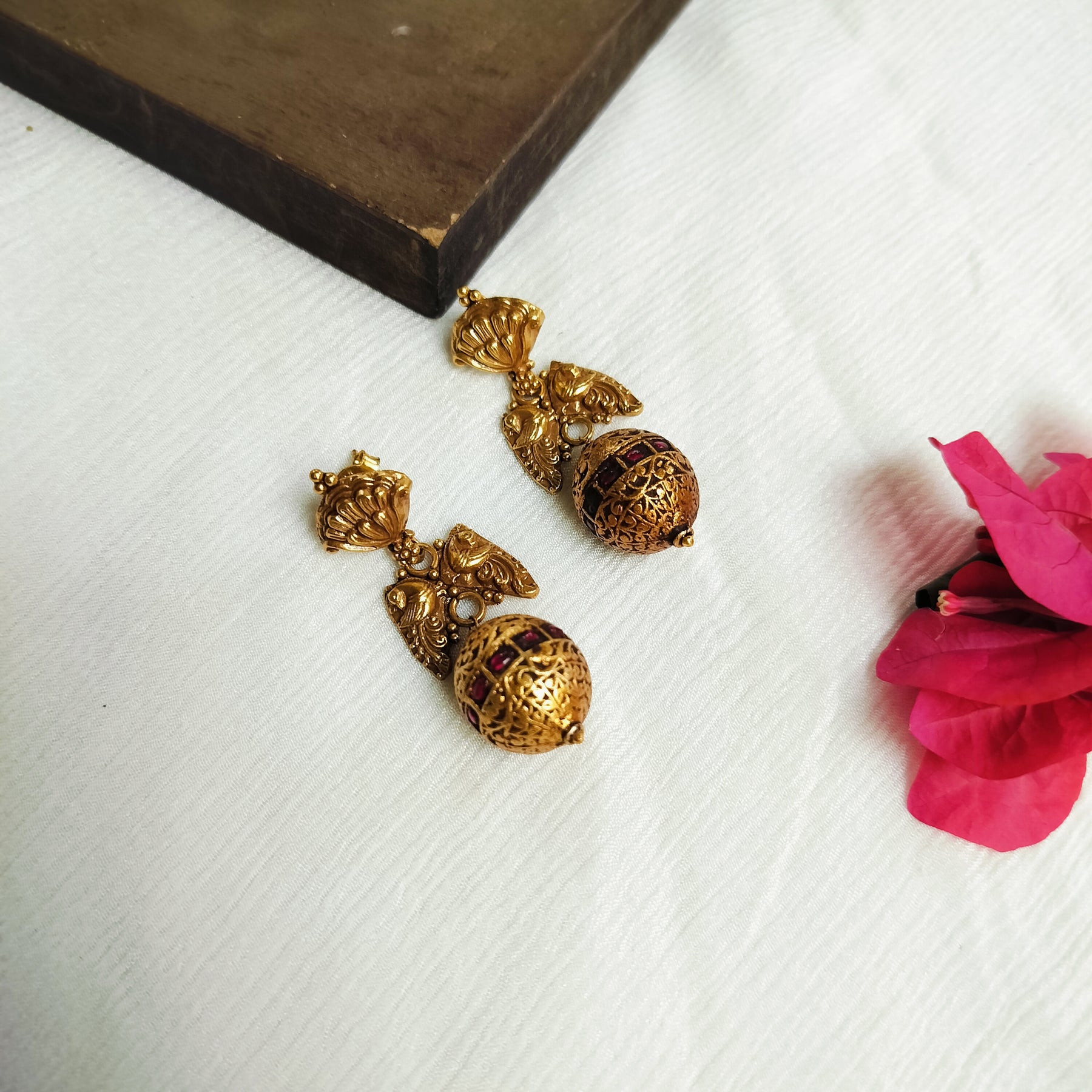 These striking silver earrings, with a rich gold-plated finish, feature a beautiful "Jali" or filigree work on the main body of the jhumka. Adorned with deep red stones, likely Kundan, the intricate design on the upper part adds a royal touch, making them an ideal choice for grand occasions and traditional wear.