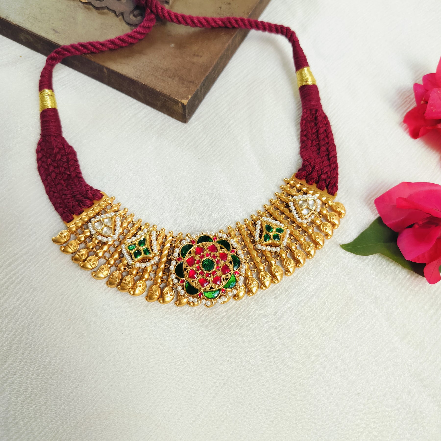 This striking silver necklace features a gold-plated finish and a traditional maroon threaded cord. The intricate craftsmanship includes a central floral motif with vibrant red and green accents, flanked by delicate, textured gold panels, creating a piece that exudes regal elegance and cultural charm.