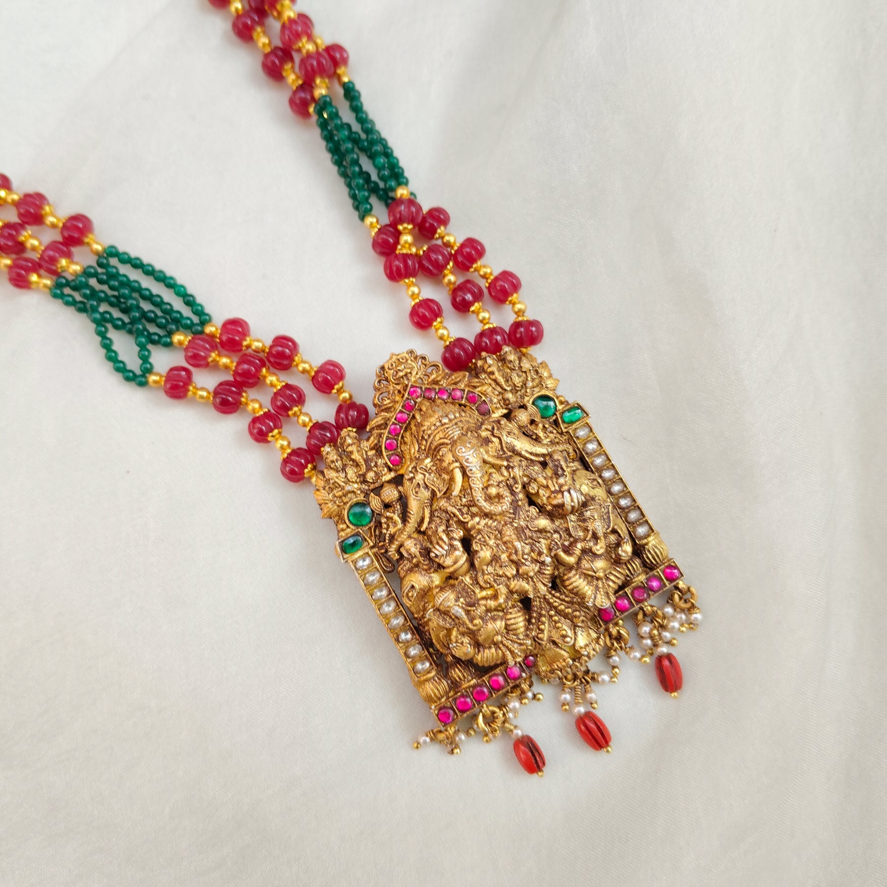 This elegant temple necklace is crafted in silver with a traditional antique gold finish, featuring a finely detailed Lord Ganesha motif.