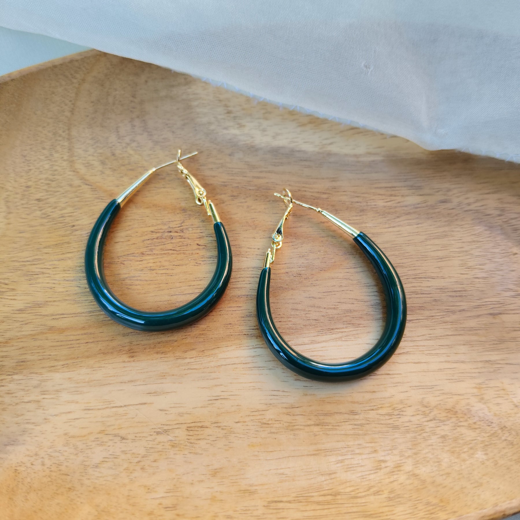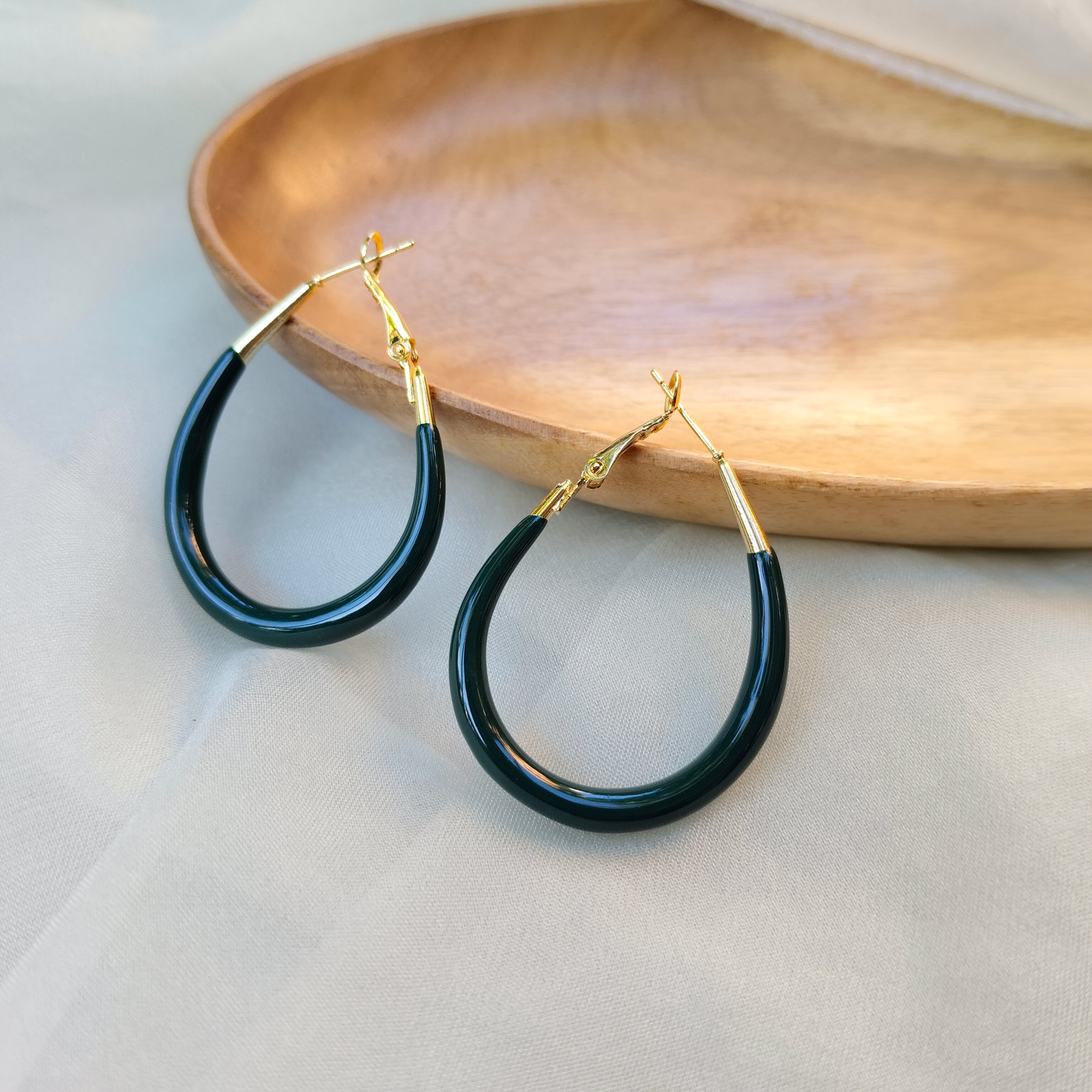 These trendy earrings feature a unique black and gold color combination that adds a touch of personality to any outfit. The simple hoop design makes these earrings versatile and easy to pair with other jewelry.