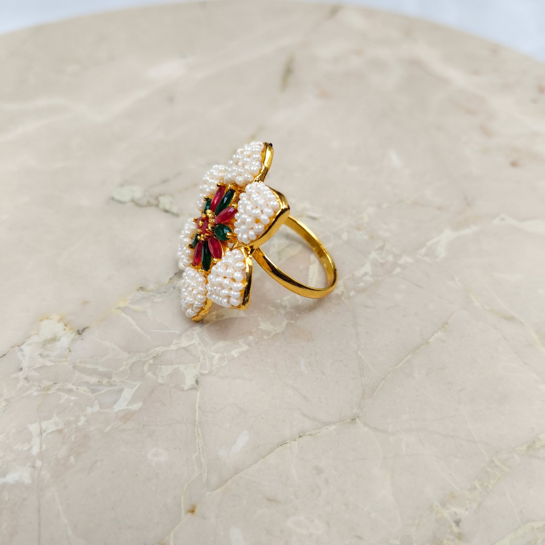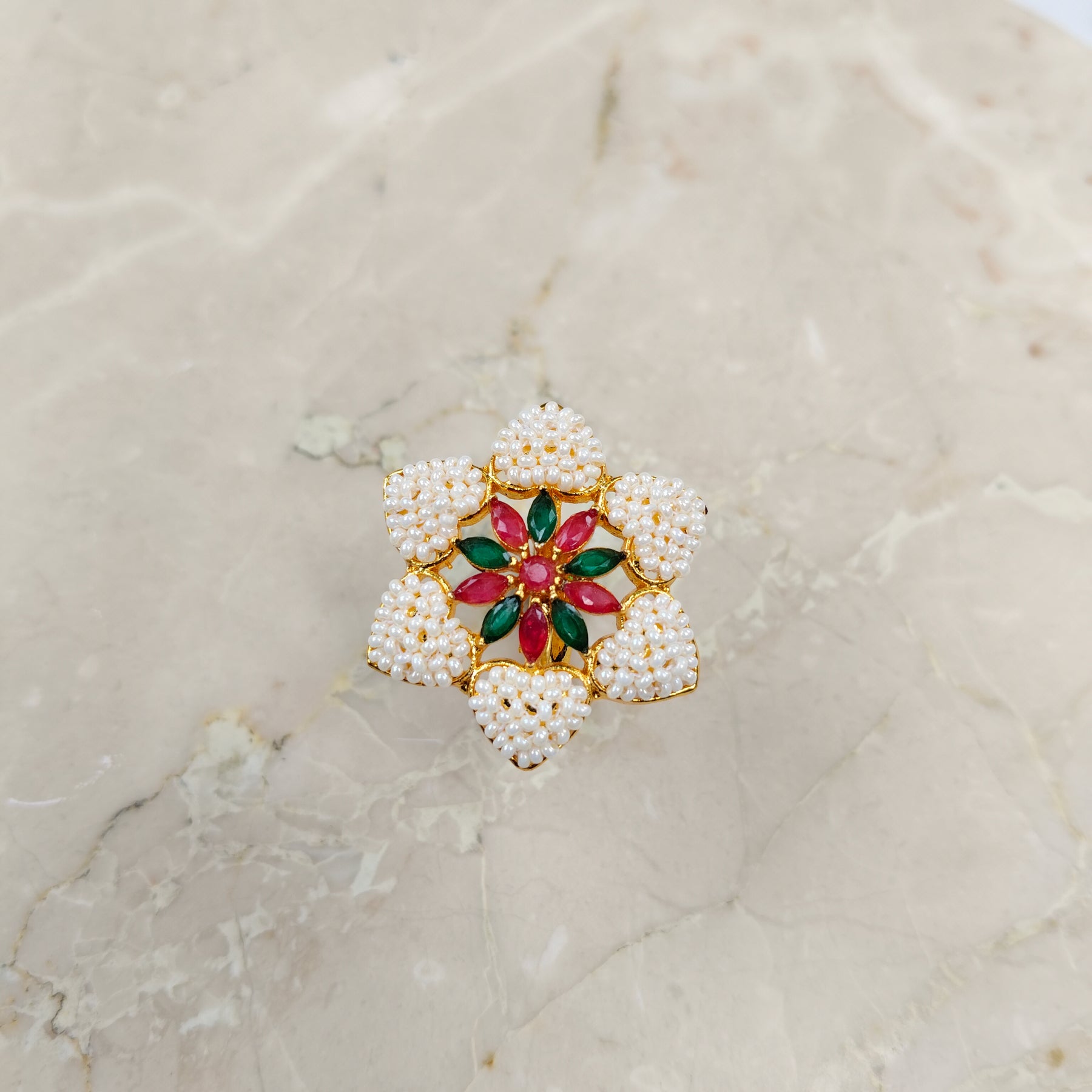 This enchanting ring features a delicate floral design with a cluster of colorful stones set in a bed of pearls. The brass material adds a touch of warmth and elegance, making it a perfect accessory for any occasion.
