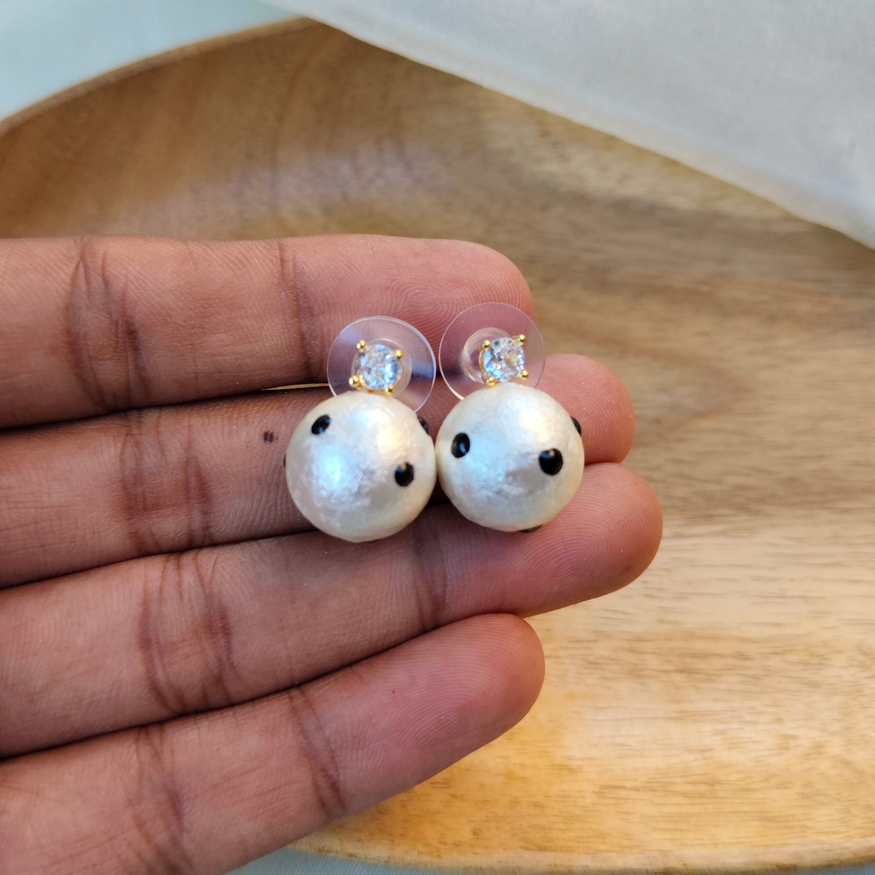 These minimalist earrings feature a simple pearl design with a black accent. The gold setting and simple stud design make these earrings perfect for everyday wear.
