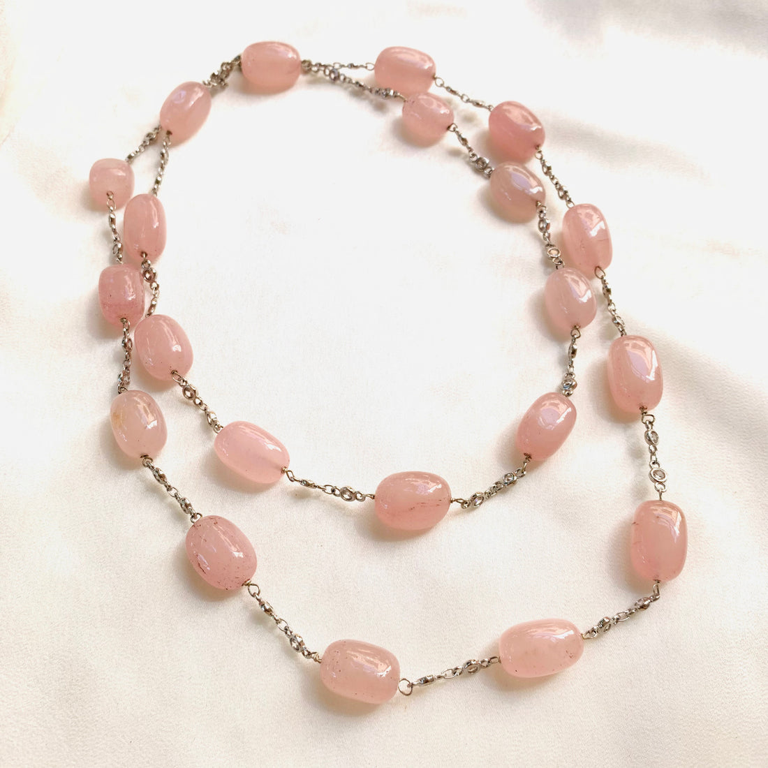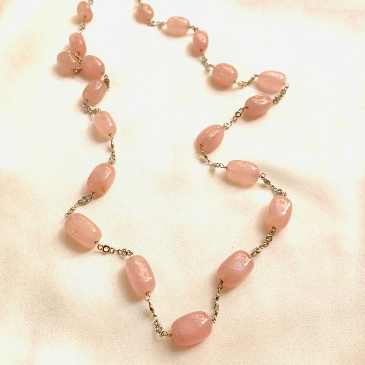 This graceful necklace features soft pink beads linked together with brass metal, creating a delicate and feminine charm. The warm hues and elegant chain design make it a versatile accessory for both casual and formal wear. A perfect blend of sophistication and simplicity, it adds a touch of elegance to any outfit.