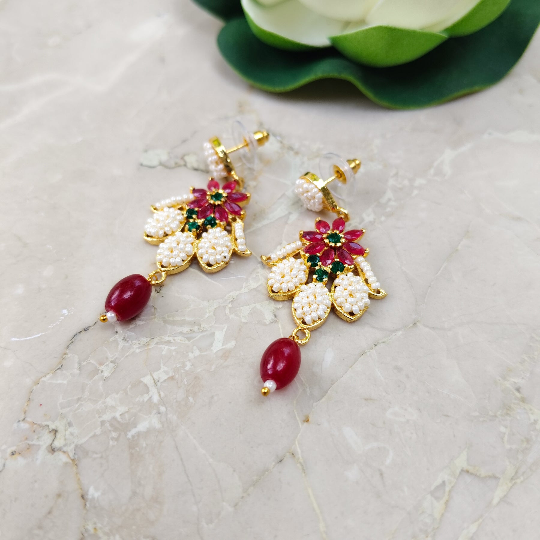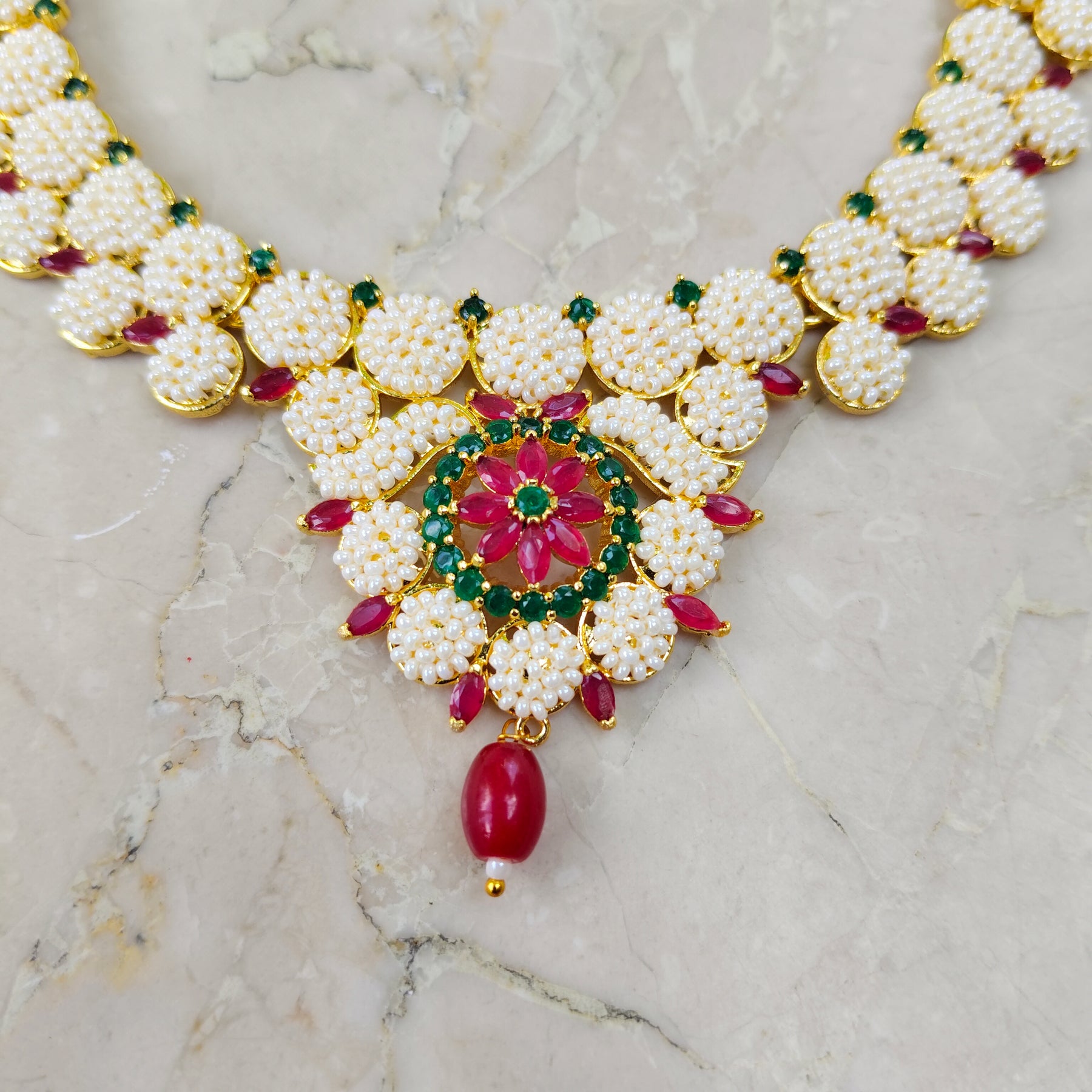 This stunning necklace is a celestial vision, with pearls cascading like stars and colorful gemstones shimmering like distant planets. The intricate design is reminiscent of a starry night sky.