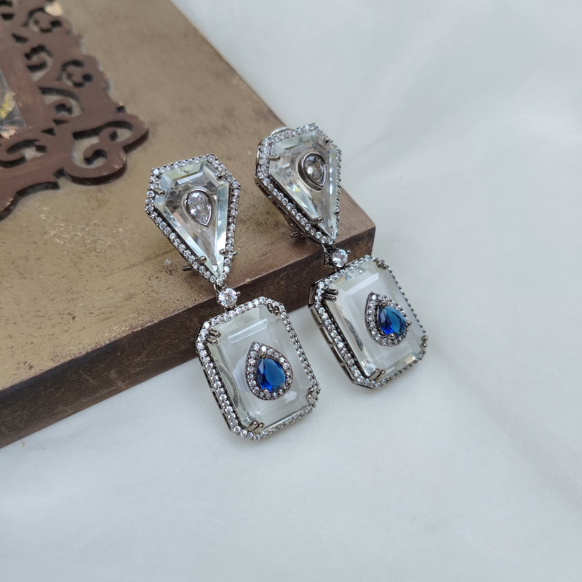 These exquisite brass earrings feature a striking geometric design with sparkling clear stones framed in delicate zircon detailing. A teardrop-shaped deep blue gem at the center adds a bold touch of elegance and contrast. Perfect for special occasions, these earrings exude sophistication and timeless charm.