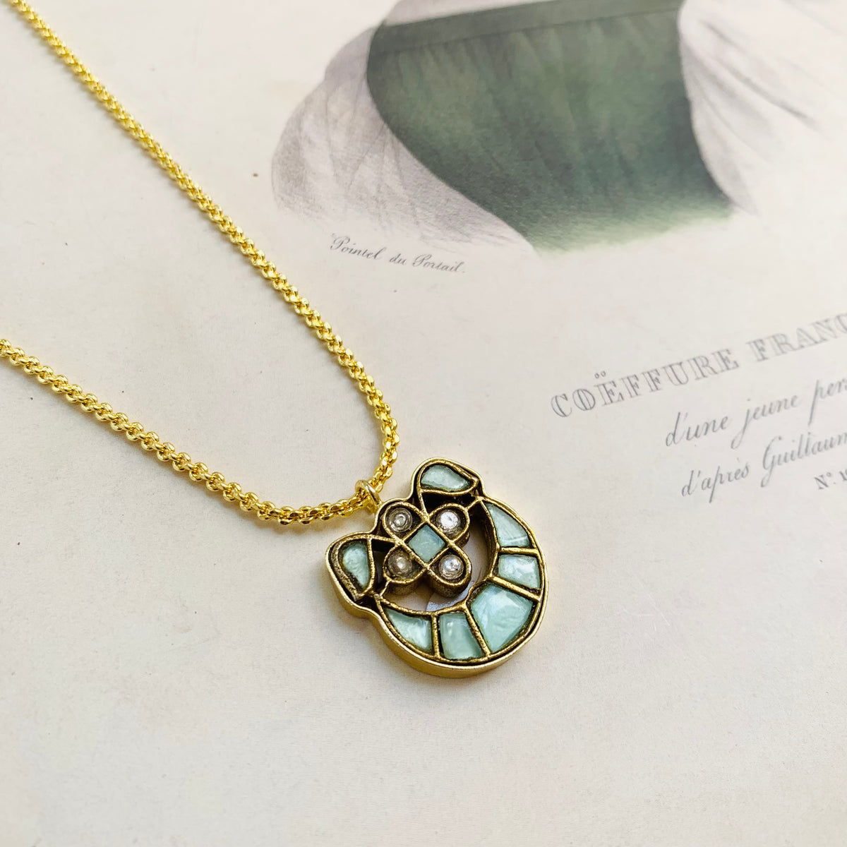 Crafted from high-quality brass, this exquisite pendant features a unique clover-inspired design with delicate green enamel inlays. The golden finish enhances its charm, while the intricate detailing adds a vintage touch. A perfect statement piece for those who love elegance with a hint of mystique.