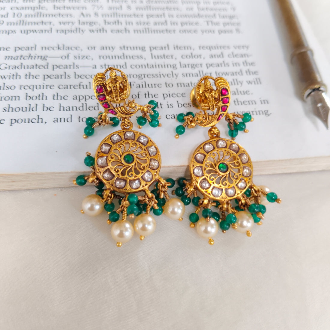 Crafted in silver with antique gold finish, these earrings showcase a divine peacock motif paired with a circular filigree design studded with shimmering stones. Accented with green beads and pearl drops, they exude traditional charm. Ideal for festive and temple occasions, they blend cultural elegance with timeless beauty.