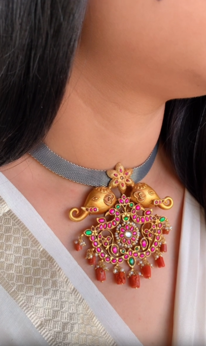 This handcrafted silver Necklace features a bold pendant inspired by lotus and peacock motifs, embellished with red and green stones. The mesh-style black band contrasts beautifully with the intricate gold-tone detailing. A striking piece that merges tradition with contemporary elegance, perfect for festive or bridal occasions.