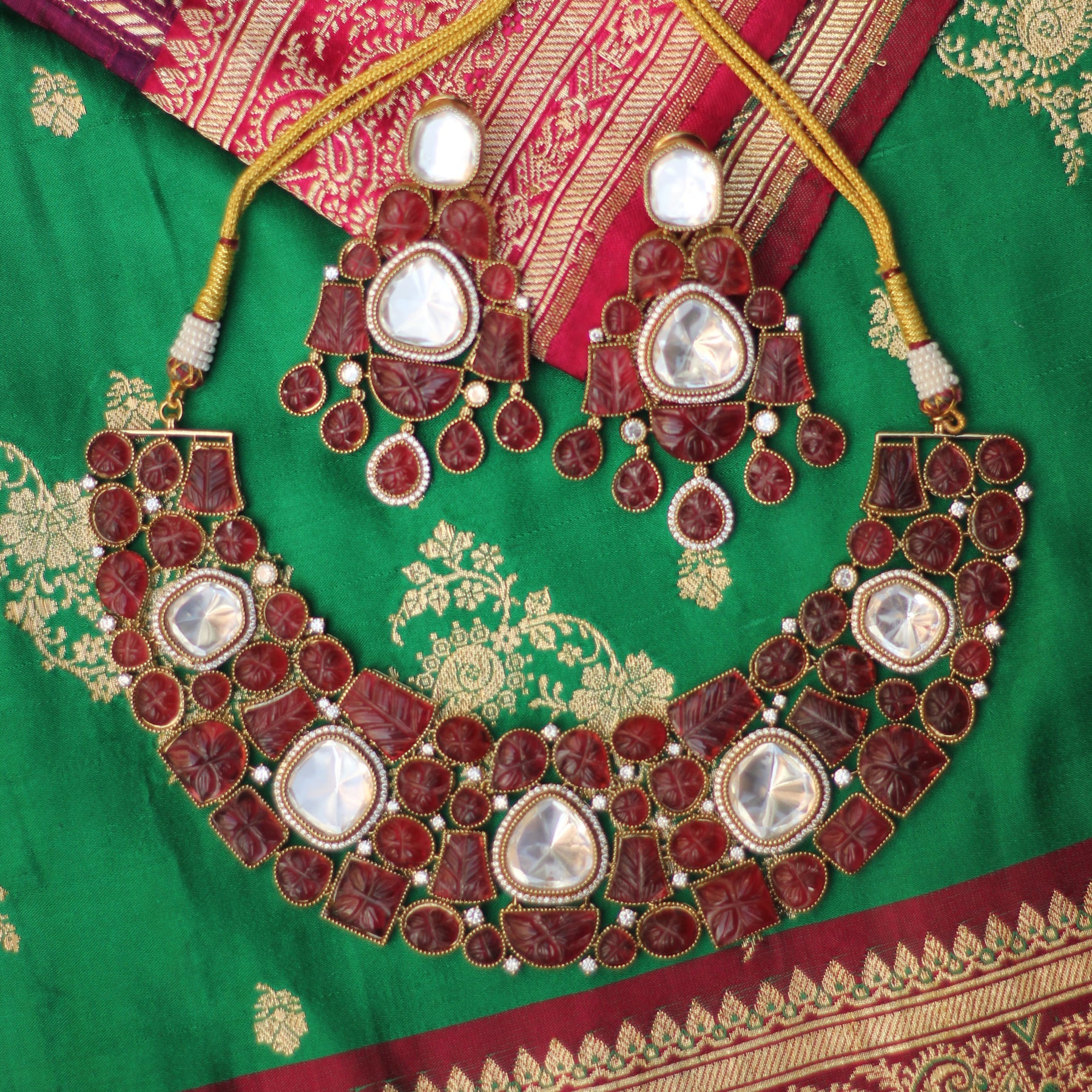 - Style: Indian fashion jewelry with matching pearl jhumka earrings.